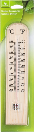 Stylový dřevěný teploměr pro interiér i exteriér s rozsahem měření -40 až +50 °C a -40 až +120 °F. Disponuje praktickým háčkem na zavěšení a kompaktními rozměry 25,5 × 5,5 cm.