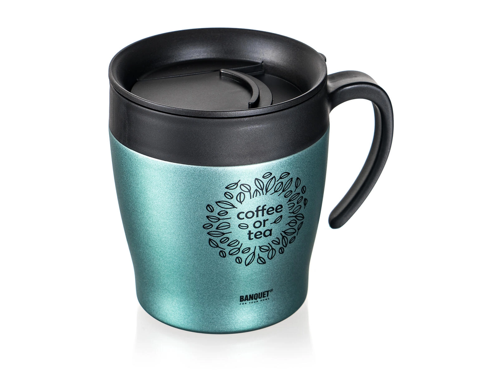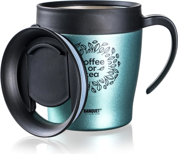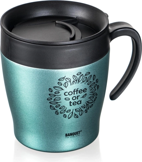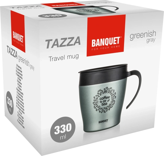 Stylový dvoustěnný cestovní termohrnek 330 ml BANQUET Tazza v zelenošedé metalíze udrží vaše nápoje déle horké i studené. Má nerezové tělo s vakuovou izolací, pohodlné víčko pro popíjení a je ideální na kávu či čaj na cesty.