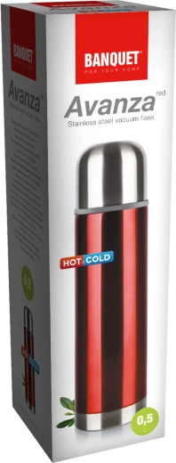 Praktická nerezová termoska AVANZA o objemu 0,5 l udrží vaše nápoje dlouho teplé i studené. Má dvouplášťové provedení, odolné nerezové tělo, metalický červený povrch a plastový uzávěr s clip mechanismem pro pohodlné otevírání jedním stiskem. Víčko lze použít jako pohárek na pití.
