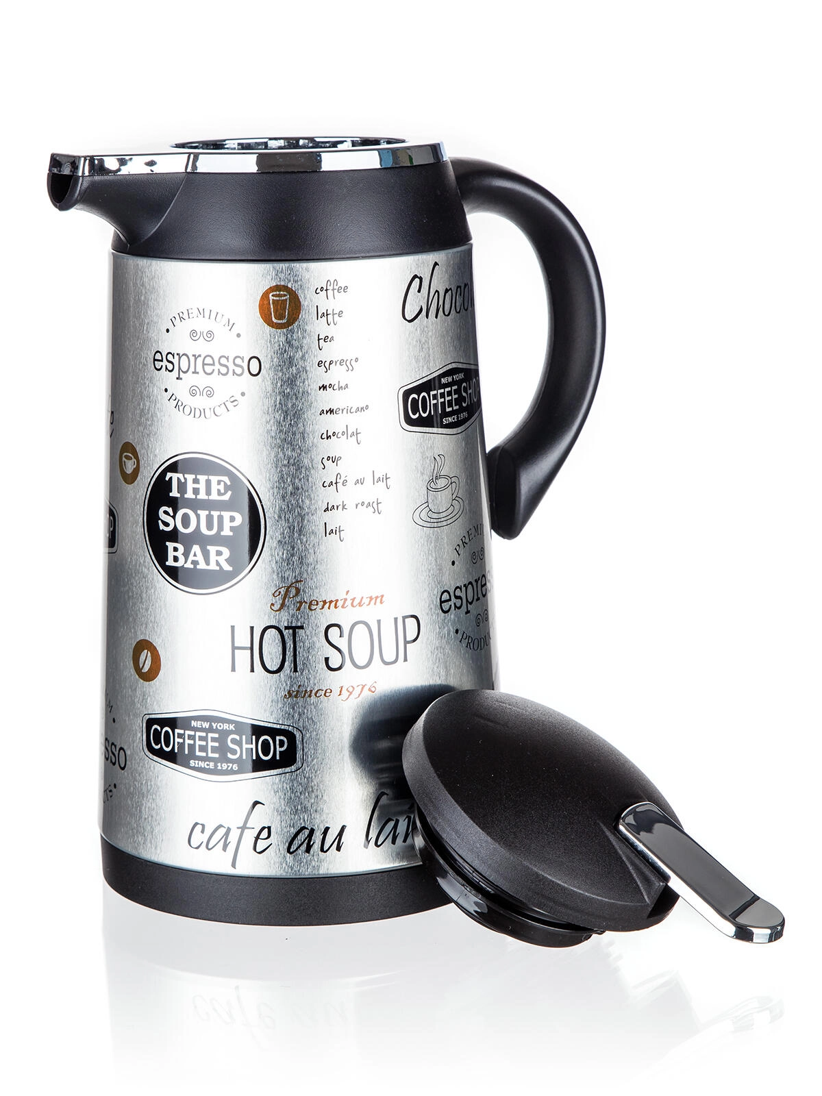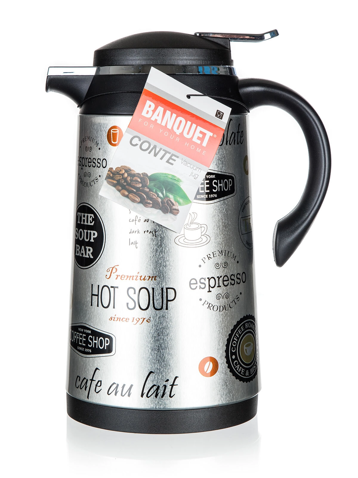Termokonvice CONTE kombinuje praktičnost a moderní design. Díky skleněné termoizolační vložce si káva, čaj nebo studené limonády uchovají svou teplotu po dlouhou dobu. Nerezový plášť s dekorativním potiskem dodává konvici odolnost a atraktivní vzhled, zatímco ergonomické plastové držadlo z PP zajišťuje pohodlné a bezpečné nalévání.