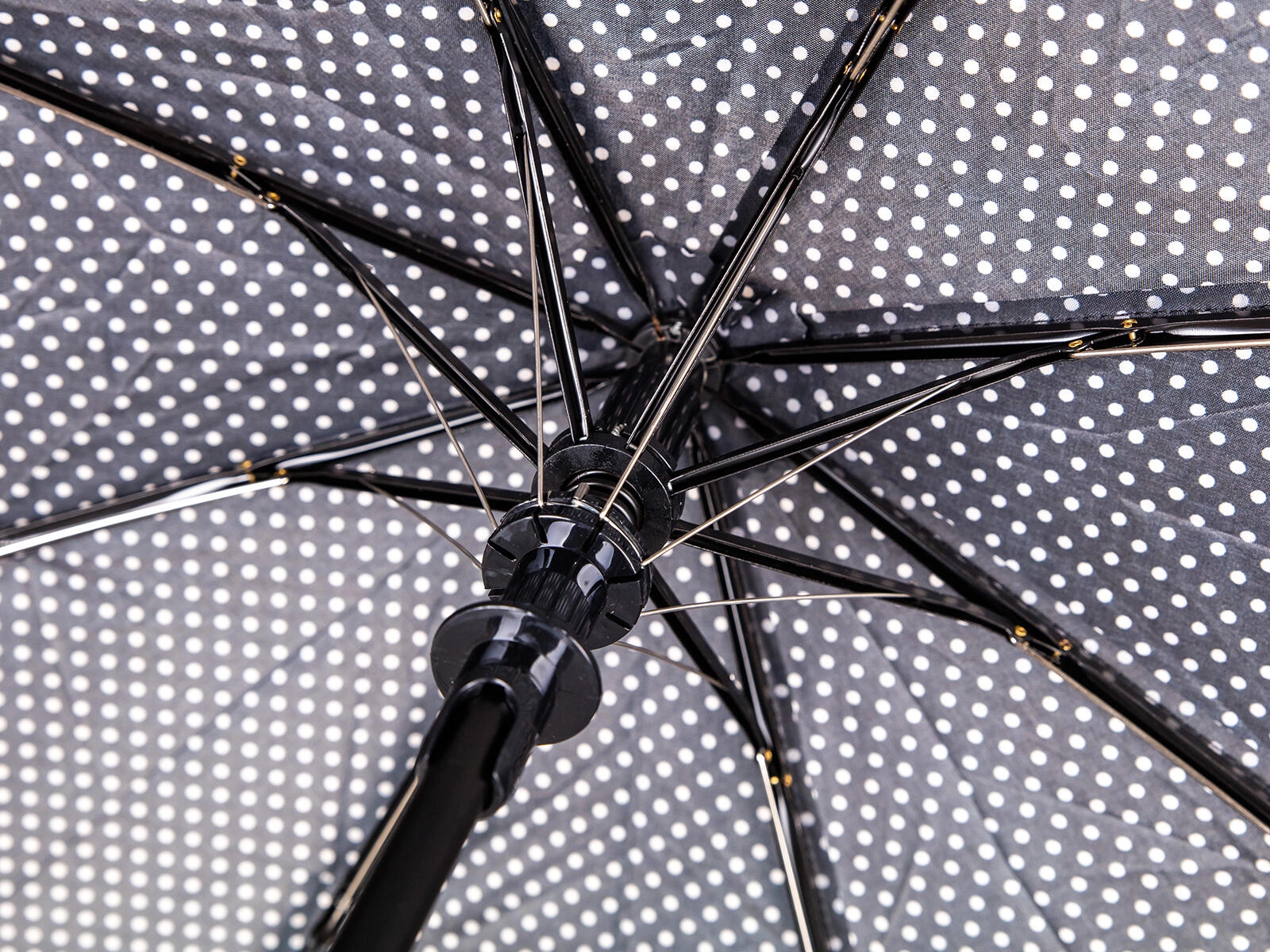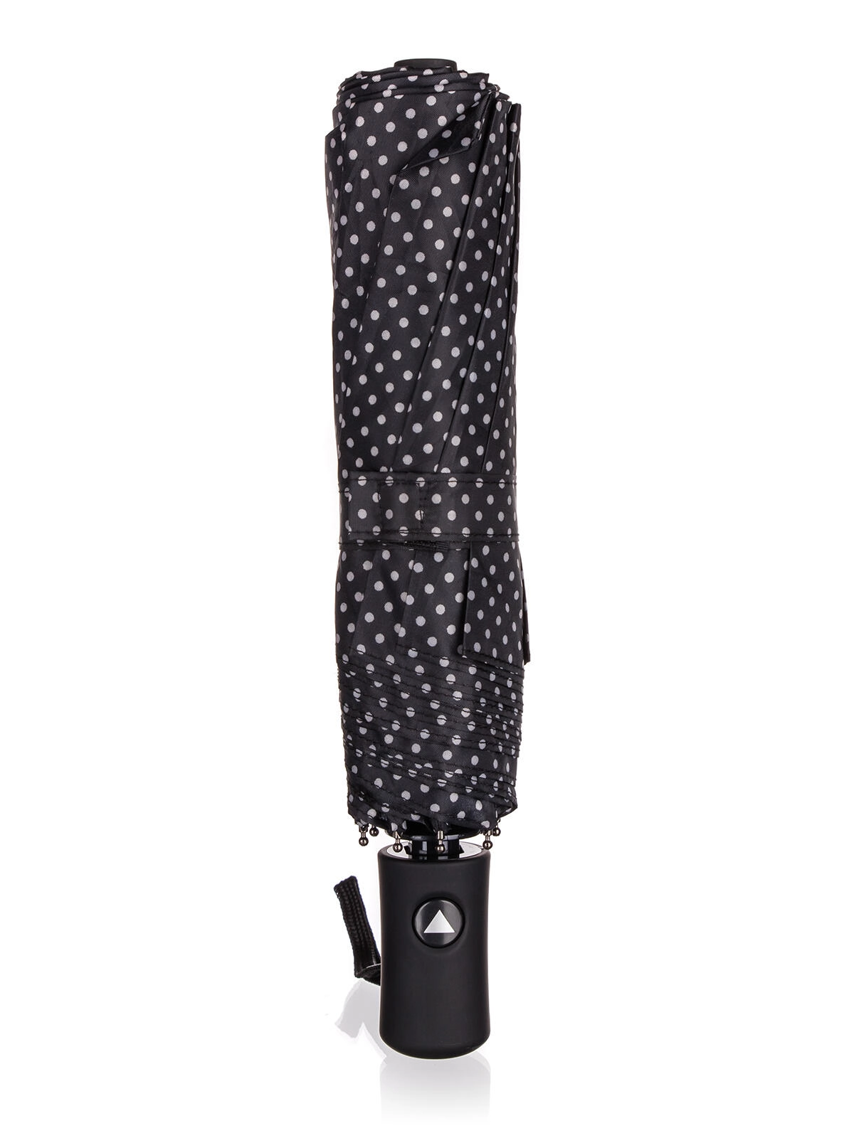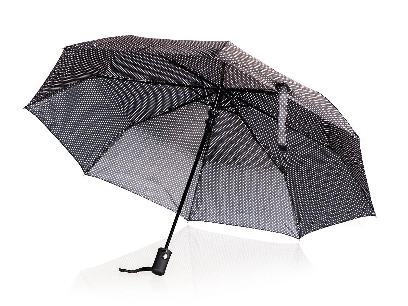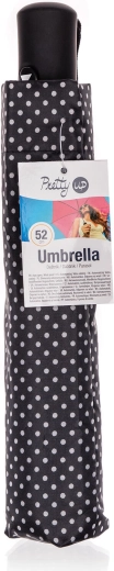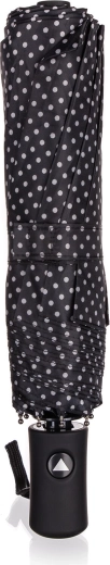 Elegantní skládací deštník s průměrem 52 cm v černé barvě s bílými puntíky nabízí spolehlivou ochranu proti dešti i slunci. Díky automatickému otevírání, větruodolné konstrukci a nepromokavému polyesteru je ideální do kabelky či batohu na každý den.