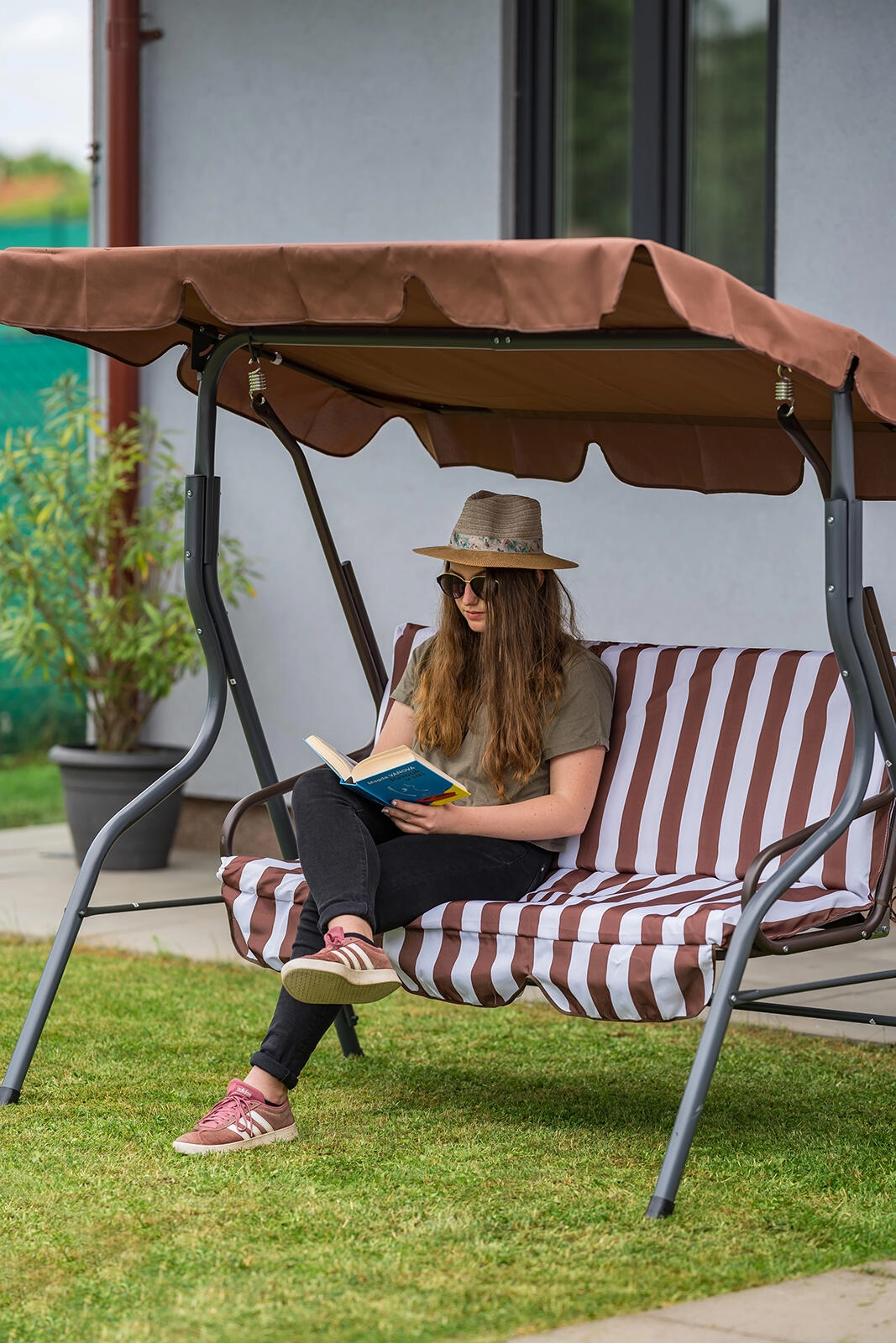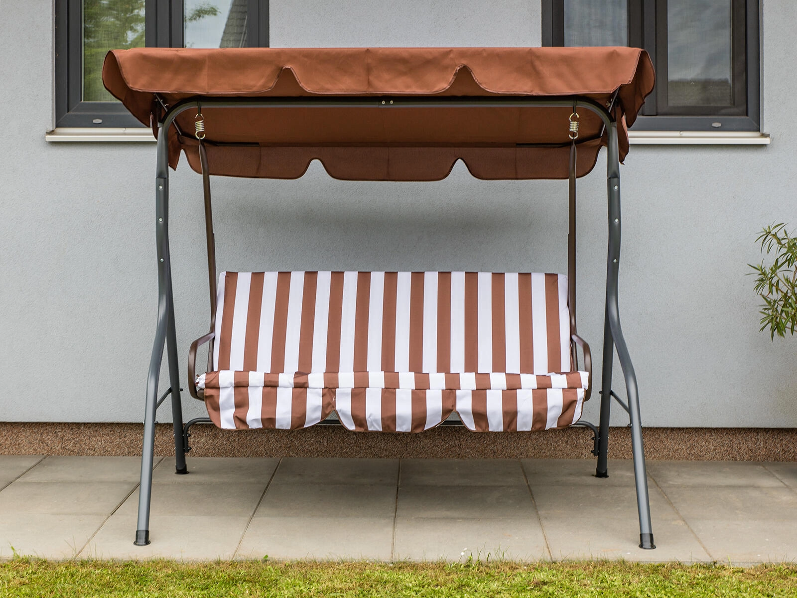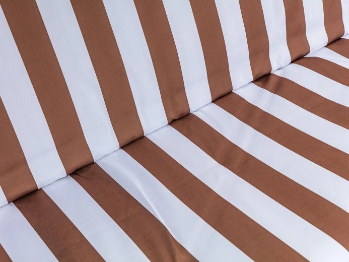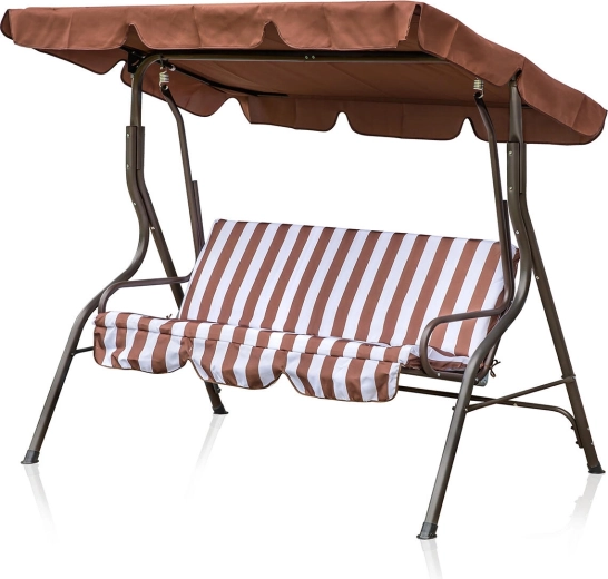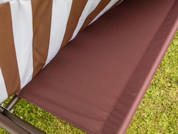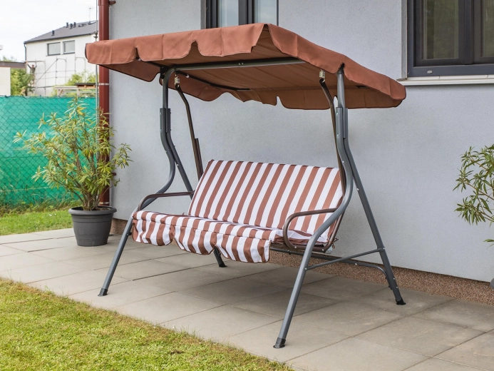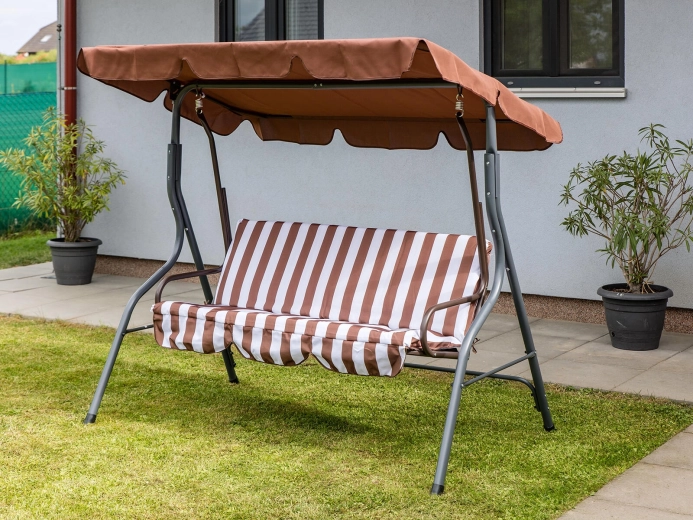 Zahradní houpačka PANAMA je ideální volbou pro terasy i zahrady. Robustní rám s práškovým lakováním odolá povětrnosti a třímístný sedák s 6cm polstrováním nabídne pohodlí při odpočinku i posezení s přáteli. Elegantní hnědo‑bílý pruhovaný potah snadno sladíte s venkovním nábytkem.
