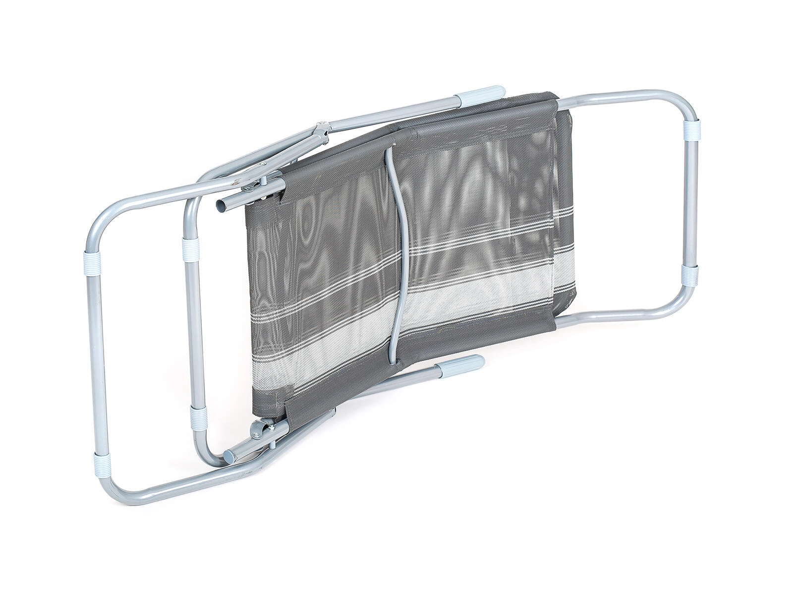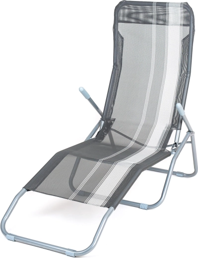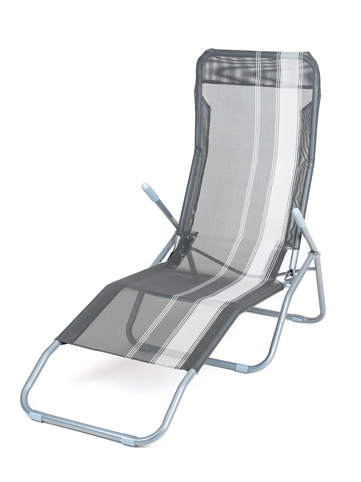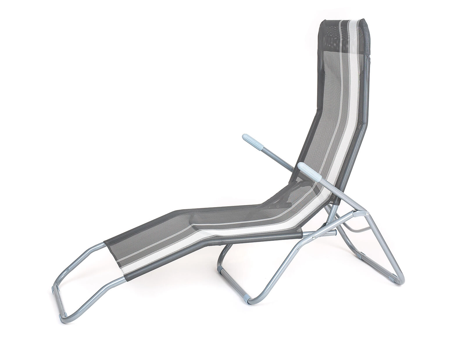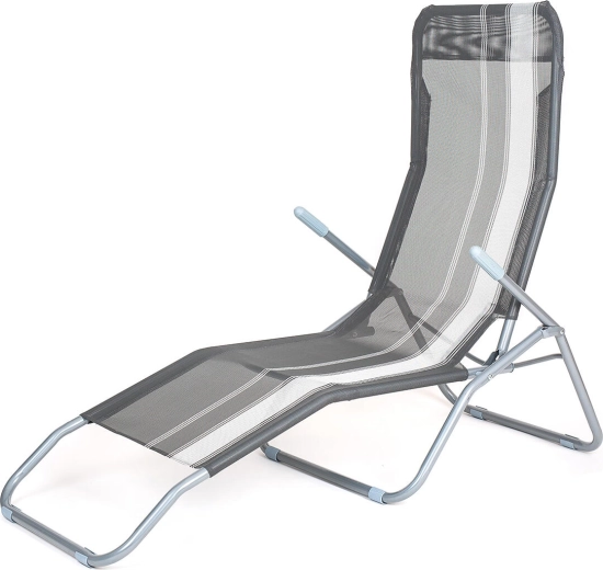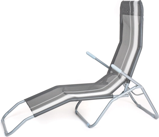 Praktické skládací lehátko kombinuje pevnou kovovou konstrukci s odolnou textilií pro maximální pohodlí a dlouhou životnost. Díky nadčasovému antracitovému provedení s dekorativními pruhy krásně zapadne k modernímu i klasickému venkovnímu nábytku.