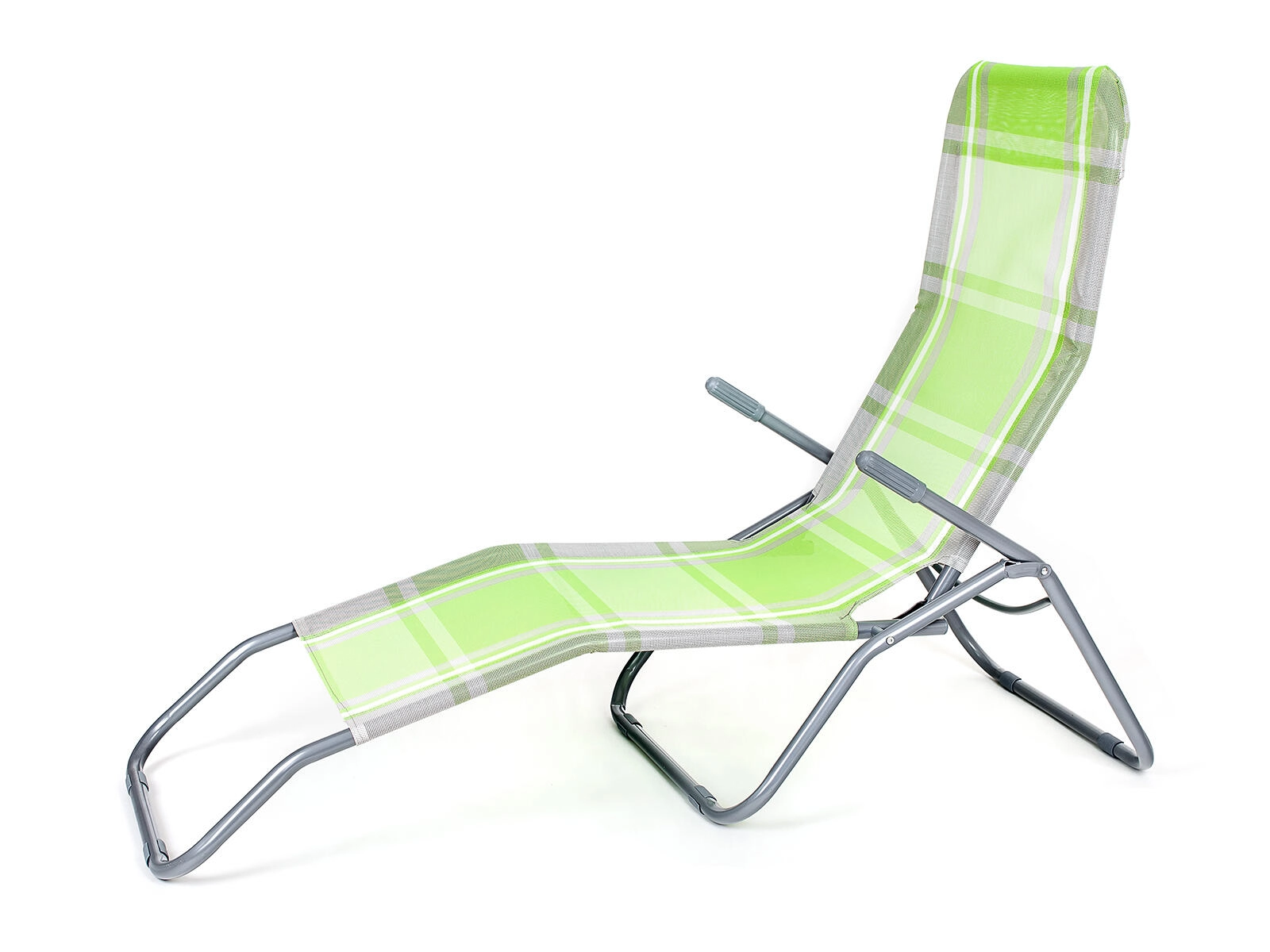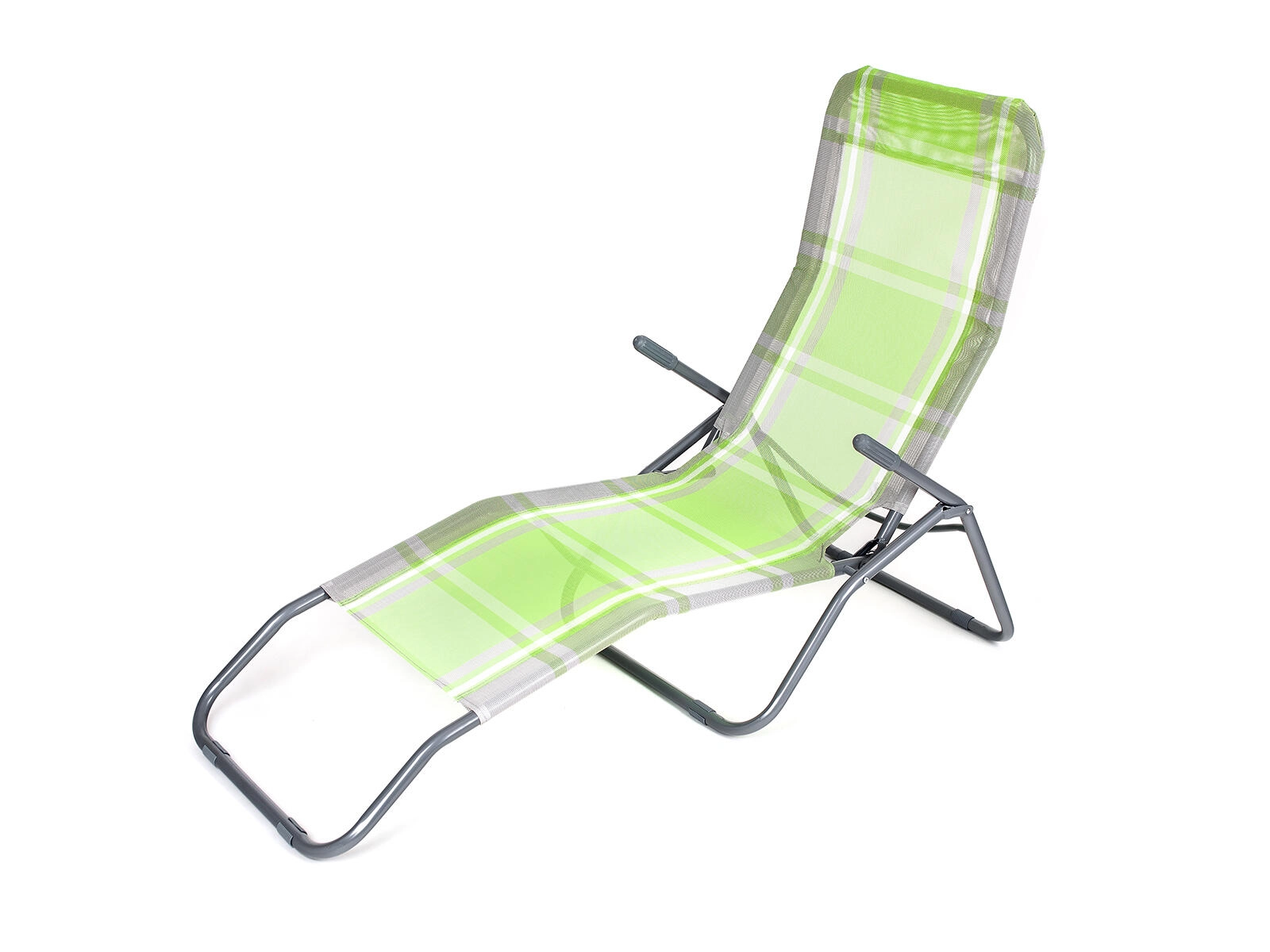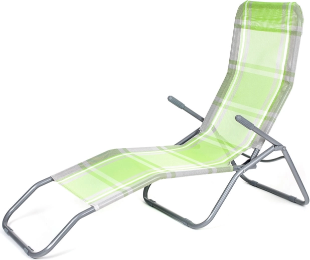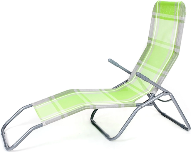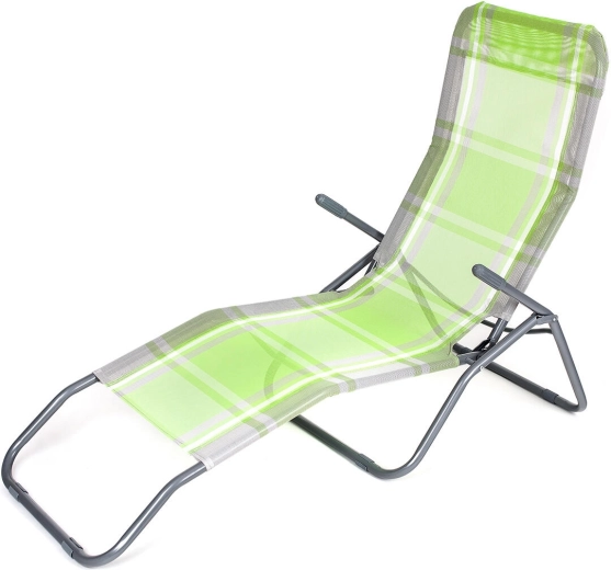 Praktické skládací lehátko v elegantní zelené barvě s kostkovaným dekorem je skvělé pro zahradu, terasu i dovolenou. Stabilní kovová konstrukce s plastovými doplňky zajišťuje dlouhou životnost, zatímco textilní výplň je příjemná, prodyšná a rychleschnoucí.