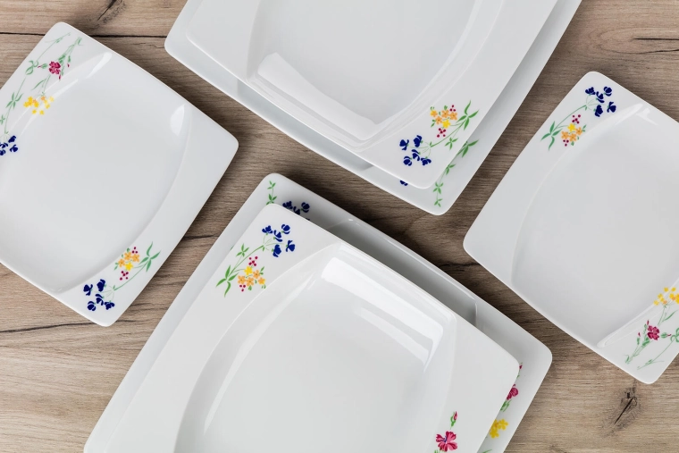 V sadě najdete vše pro kompletní servírování – od polévek přes hlavní chody až po dezerty. Čtvercový tvar s lehce zapuštěným středem pomáhá při elegantní prezentaci jídel a zabraňuje přetékání šťáv.