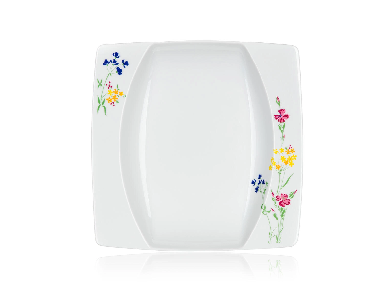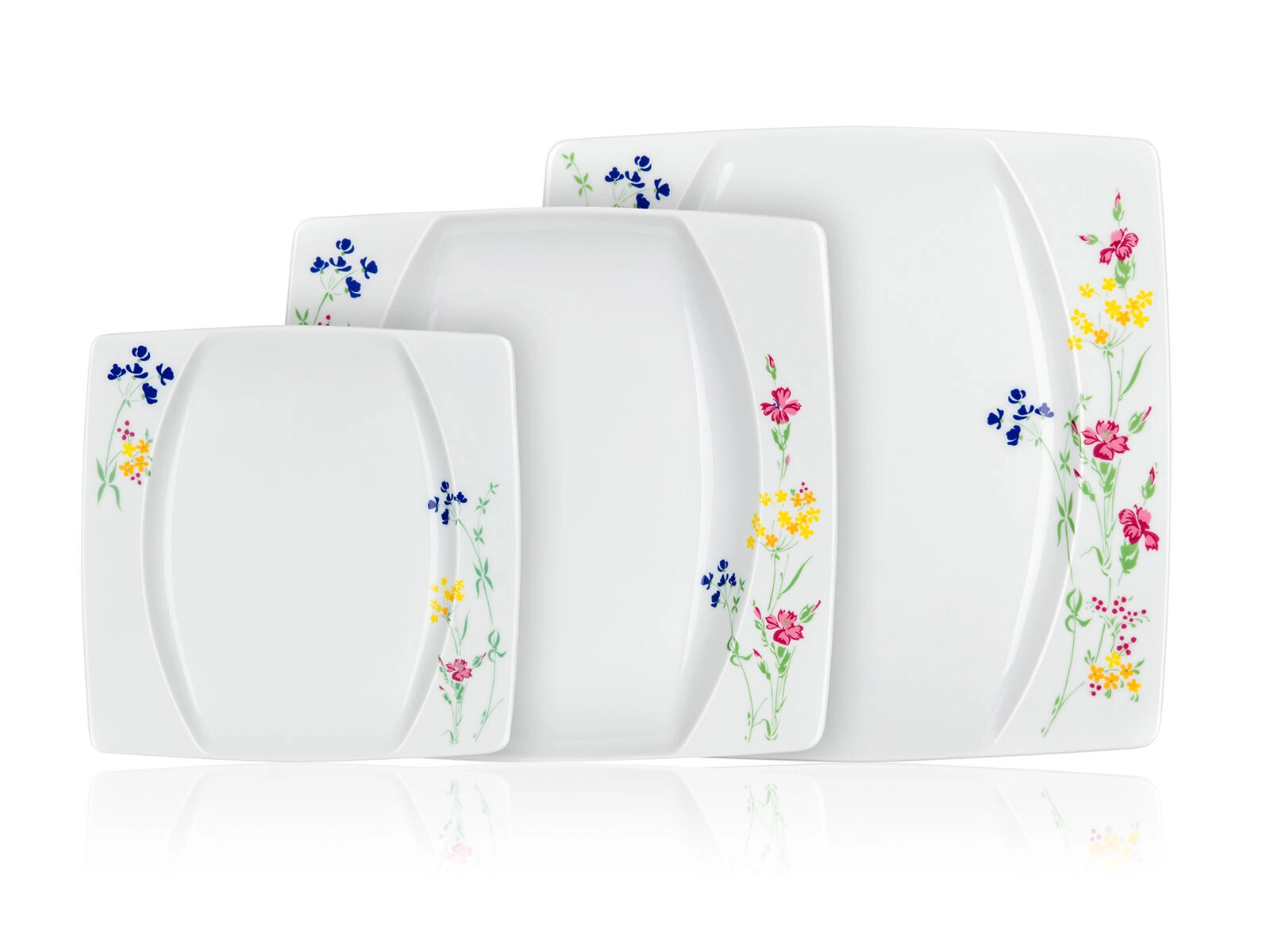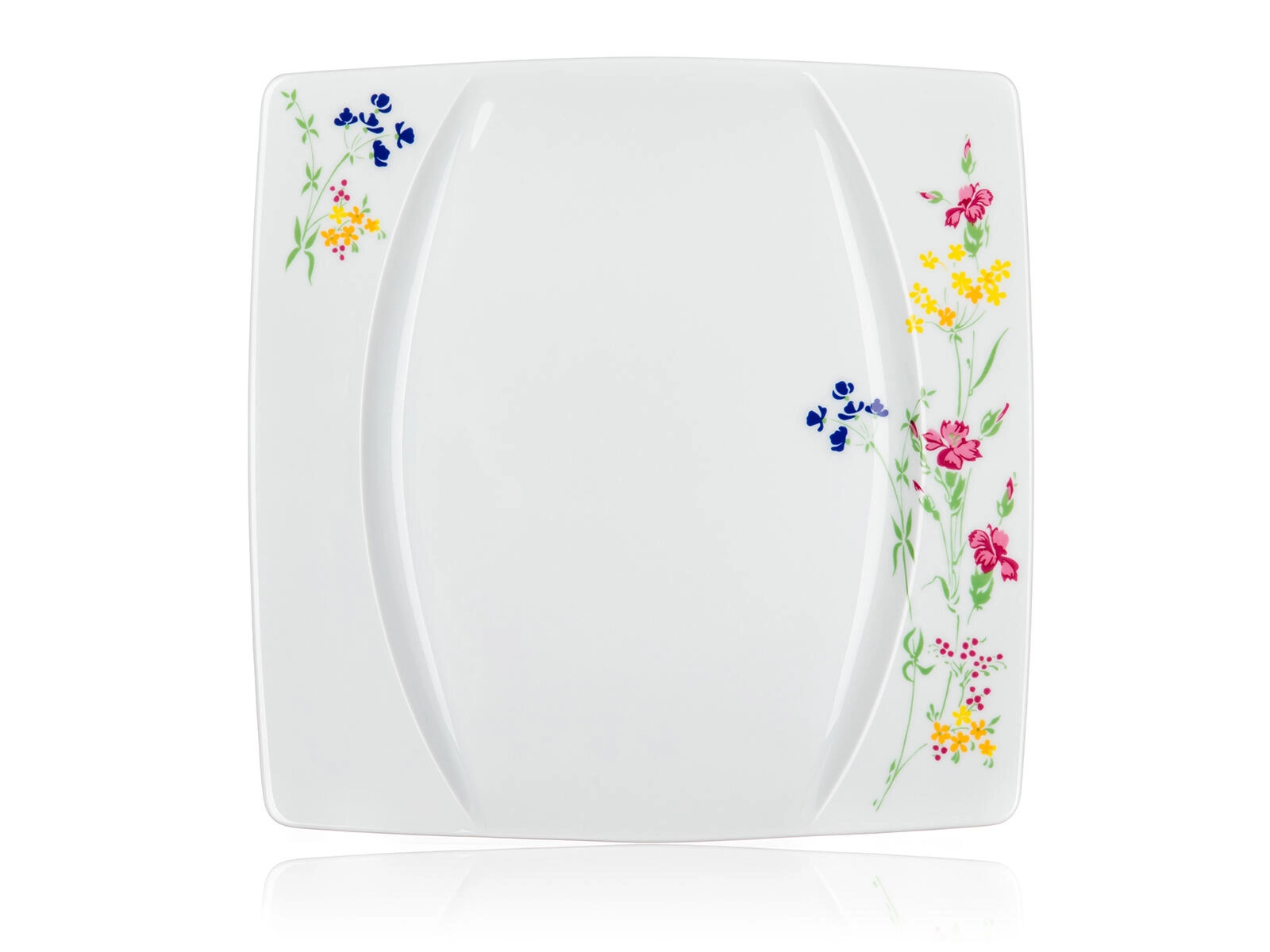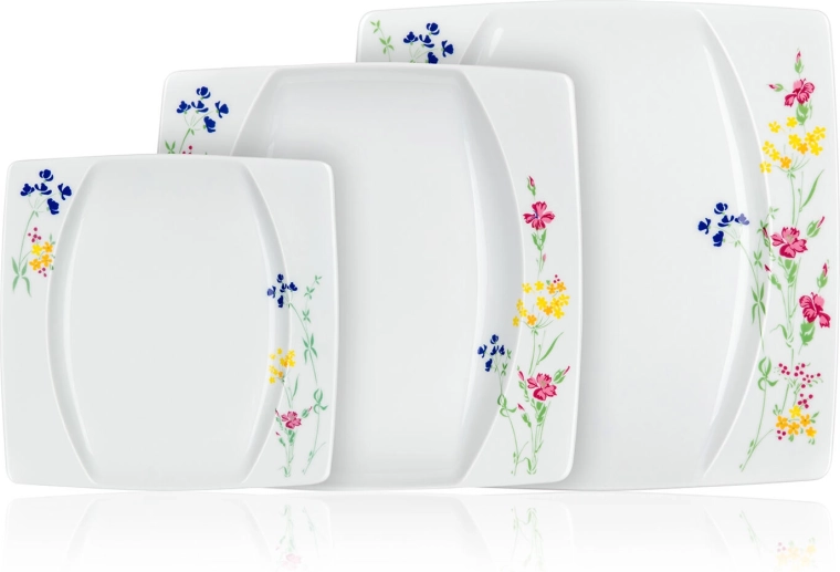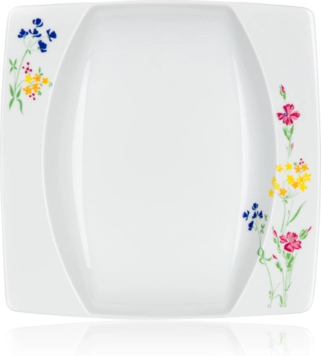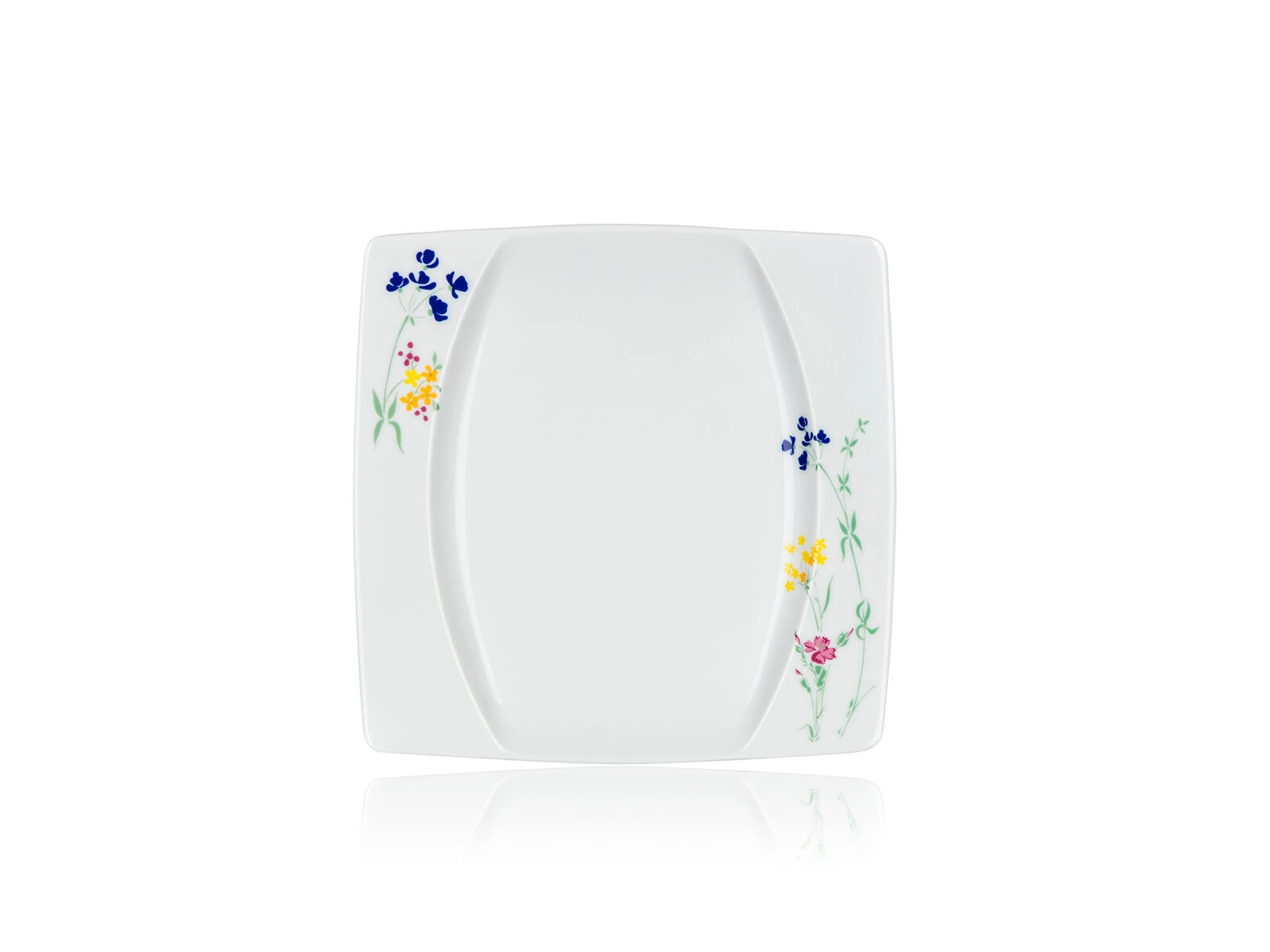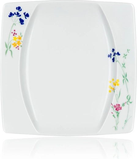 Tato nadčasová čtvercová sada kombinuje elegantní design s praktickým použitím pro každý den. Jemný květinový motiv na hranách a lesklá glazura podtrhují slavnostní i každodenní stolování. Díky odolnému porcelánu THUN se talíře snadno udržují a dlouhodobě si zachovávají barvy i lesk.