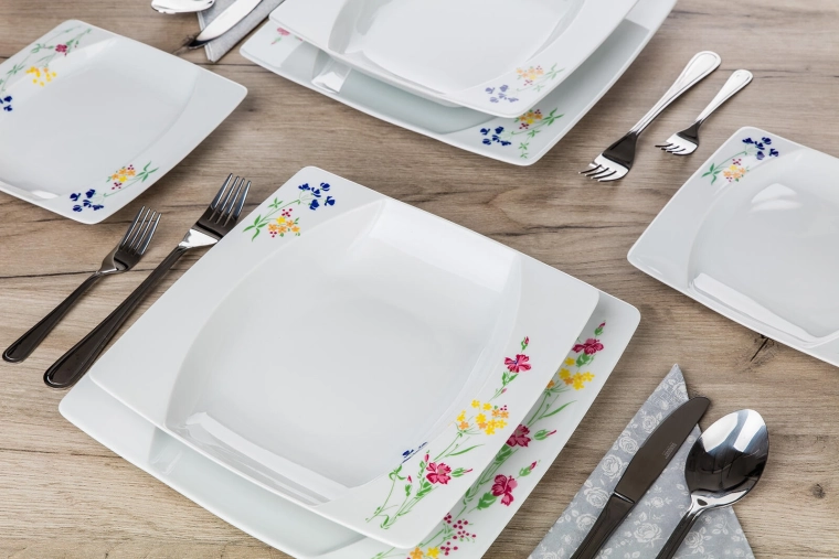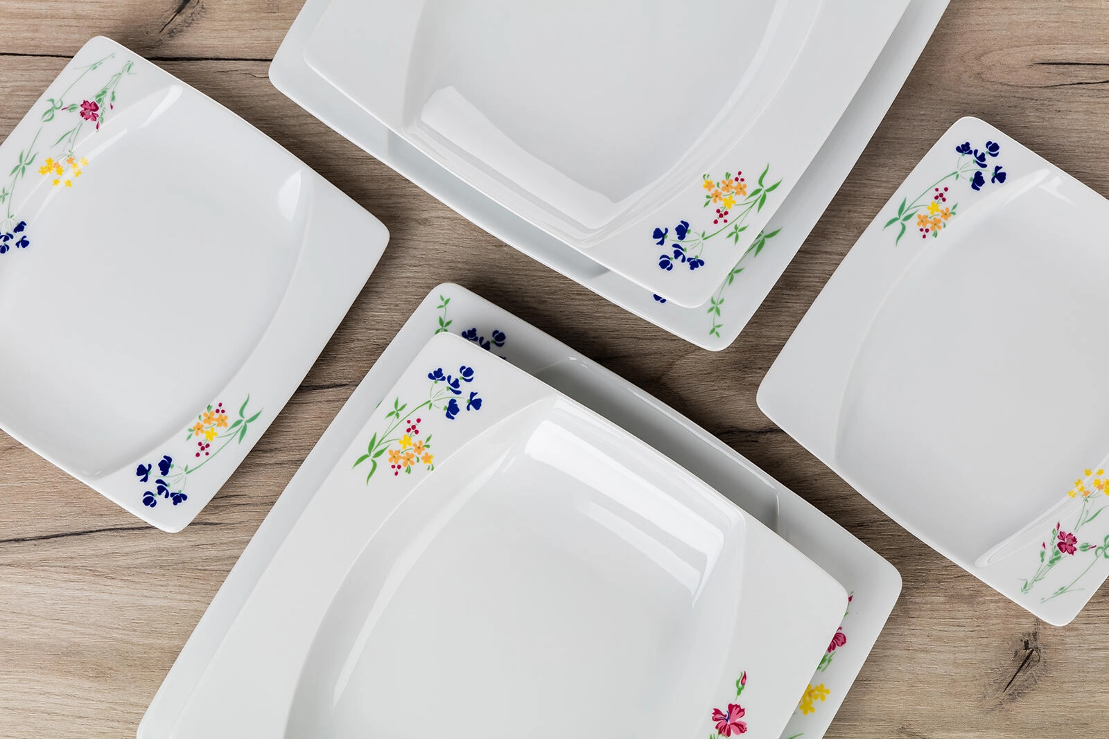Stylové čtvercové talíře s jemným květinovým potiskem na rozích dodají prostření osobitý charakter a snadno je zkombinujete s dalším nádobím.