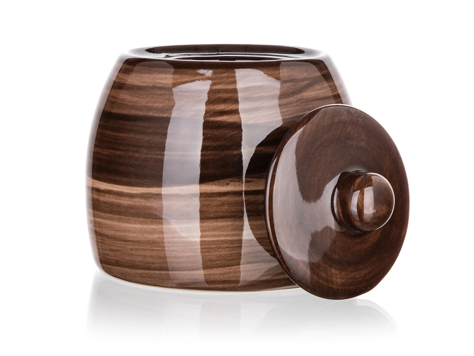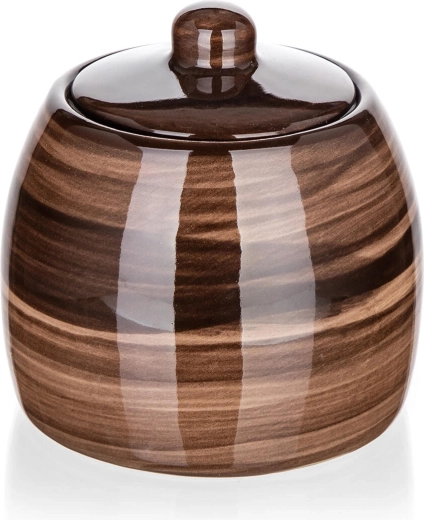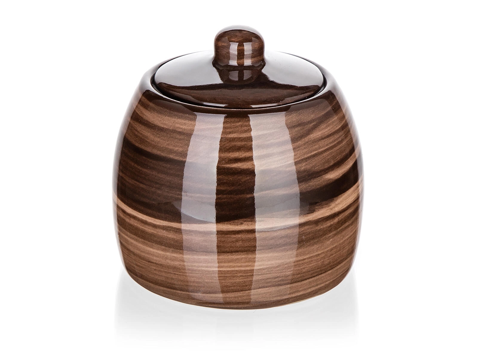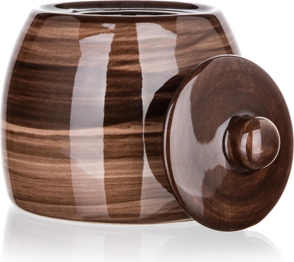 Hnědá keramická cukřenka Palas se hodí do klasické i moderní kuchyně. Stylová glazura s jemnou kresbou dřeva dodá vašemu stolování teplý a přírodní nádech, zatímco víčko s pohodlným úchopem chrání obsah před vlhkostí a nečistotami.