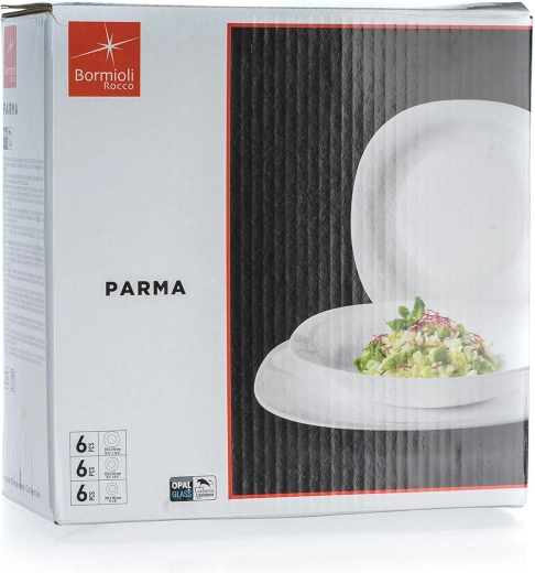 Elegantní jídelní sada PARMA pro 6 osob přináší moderní hranatý design a nadčasovou bílou barvu. Vyrobeno z kvalitního skla s vysokou odolností proti poškrábání a tepelnému šoku. Vše je vhodné do myčky i mikrovlnné trouby, takže nabízí pohodlí pro každodenní použití i slavnostní stolování.