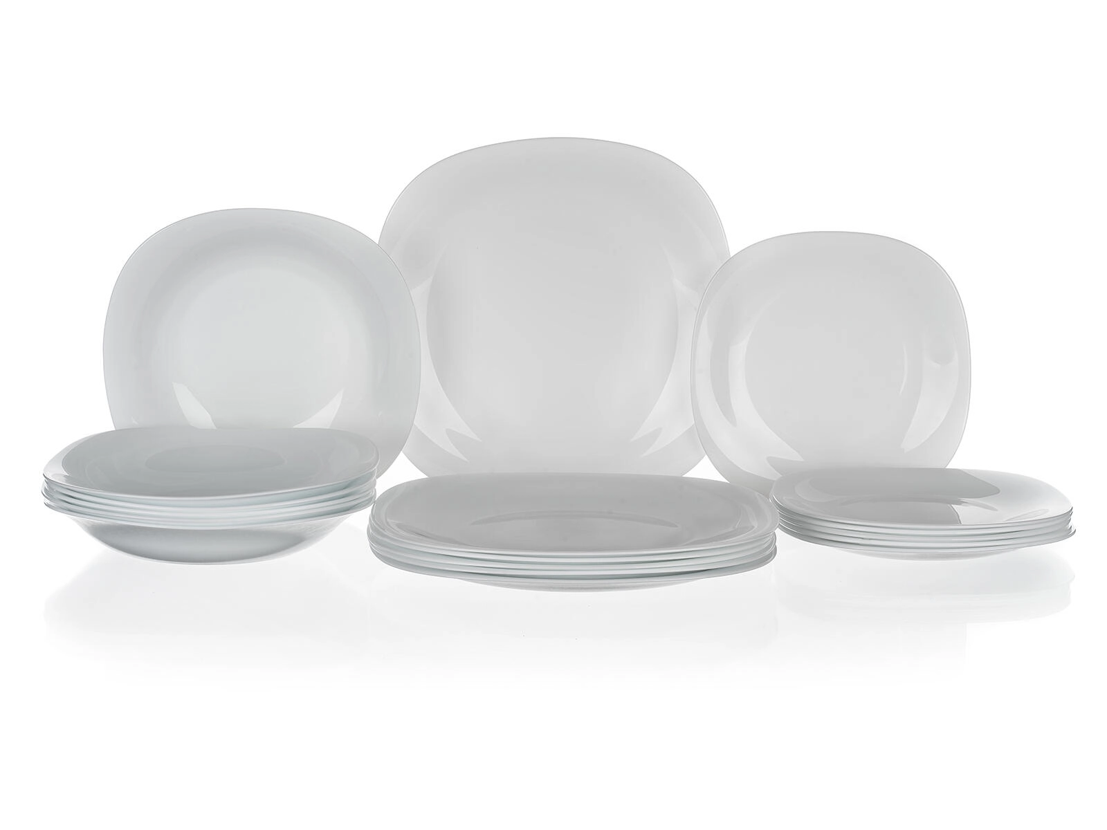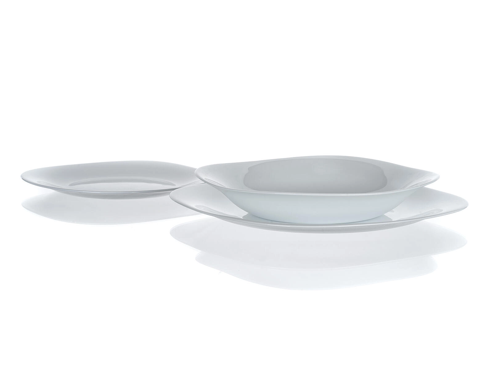 - 6× mělký talíř 27 × 27 cm, 6× hluboký talíř 23 × 23 cm, 6× desertní talíř 20 × 20 cm