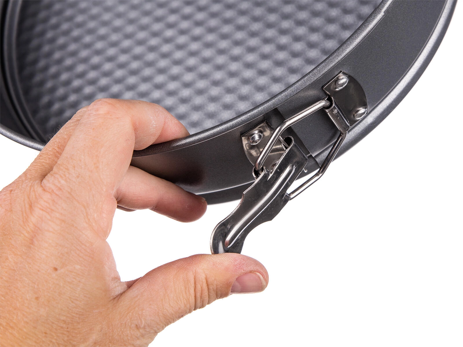 Boční uzávěr uvolní okraj formy jedním pohybem, takže dort vyjmete bez poškození a s dokonale hladkými stranami.