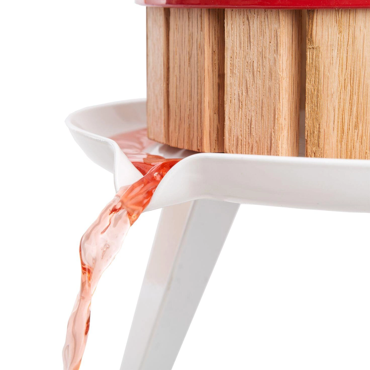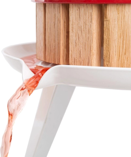 Pevná dřevěno-kovová konstrukce na stabilní základně s odtokovým žlábkem usměrní tok šťávy přímo do nádoby bez zbytečného rozlévání.