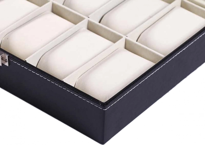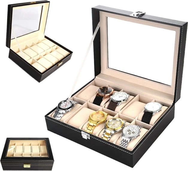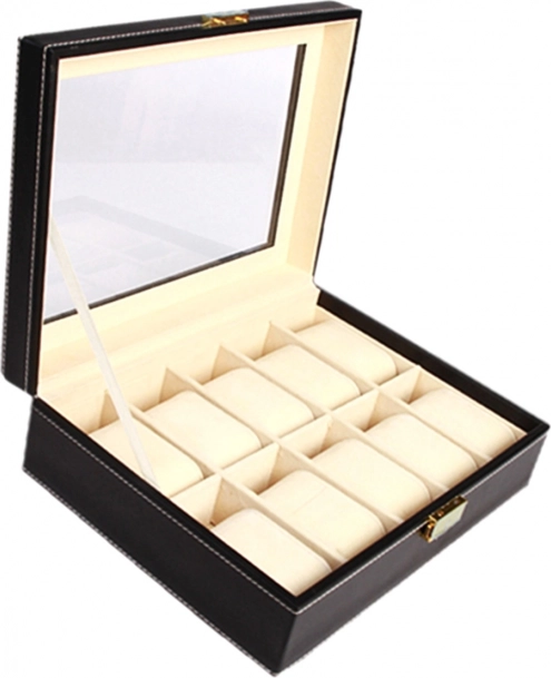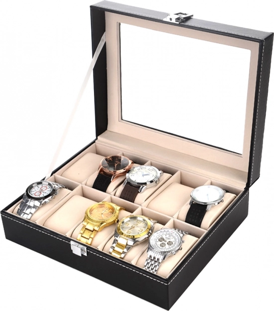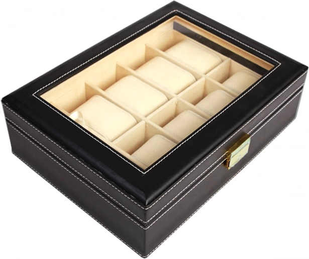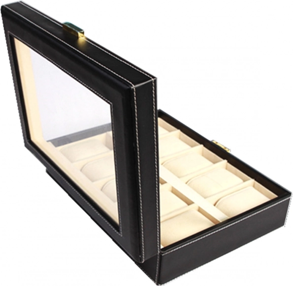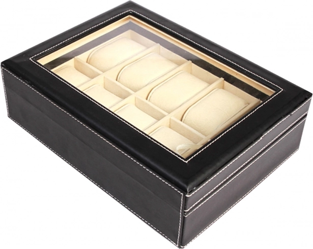 Stylový organizér na hodinky pro bezpečné uložení až 10 kusů. Černá eko kůže s kontrastním prošíváním, skleněné víko a měkké vyjímatelné polštářky zajistí ochranu před prachem a poškrábáním a zároveň přehledné vystavení kolekce. Kompaktní rozměry, kovový uzávěr a univerzální design do každého interiéru.