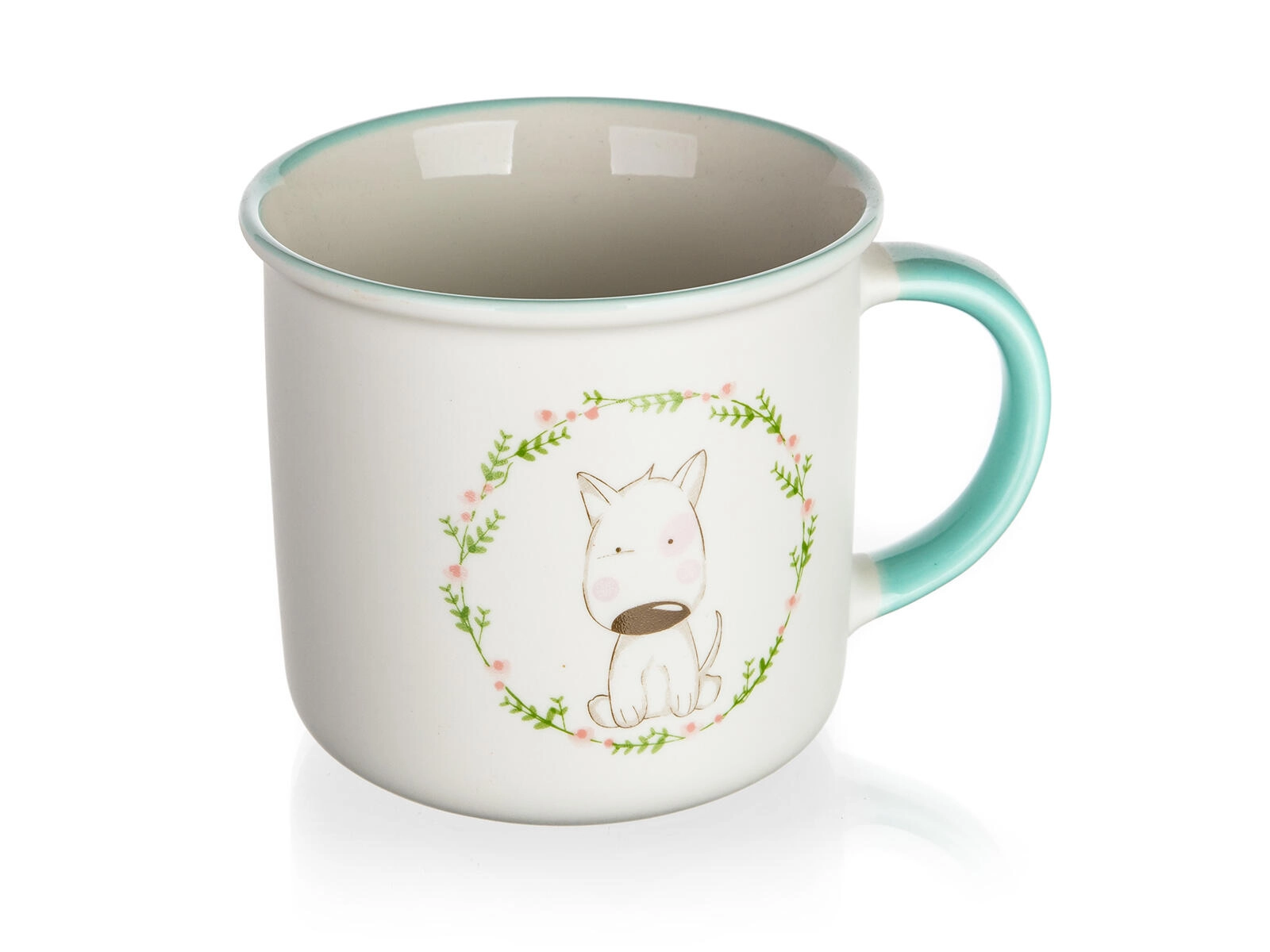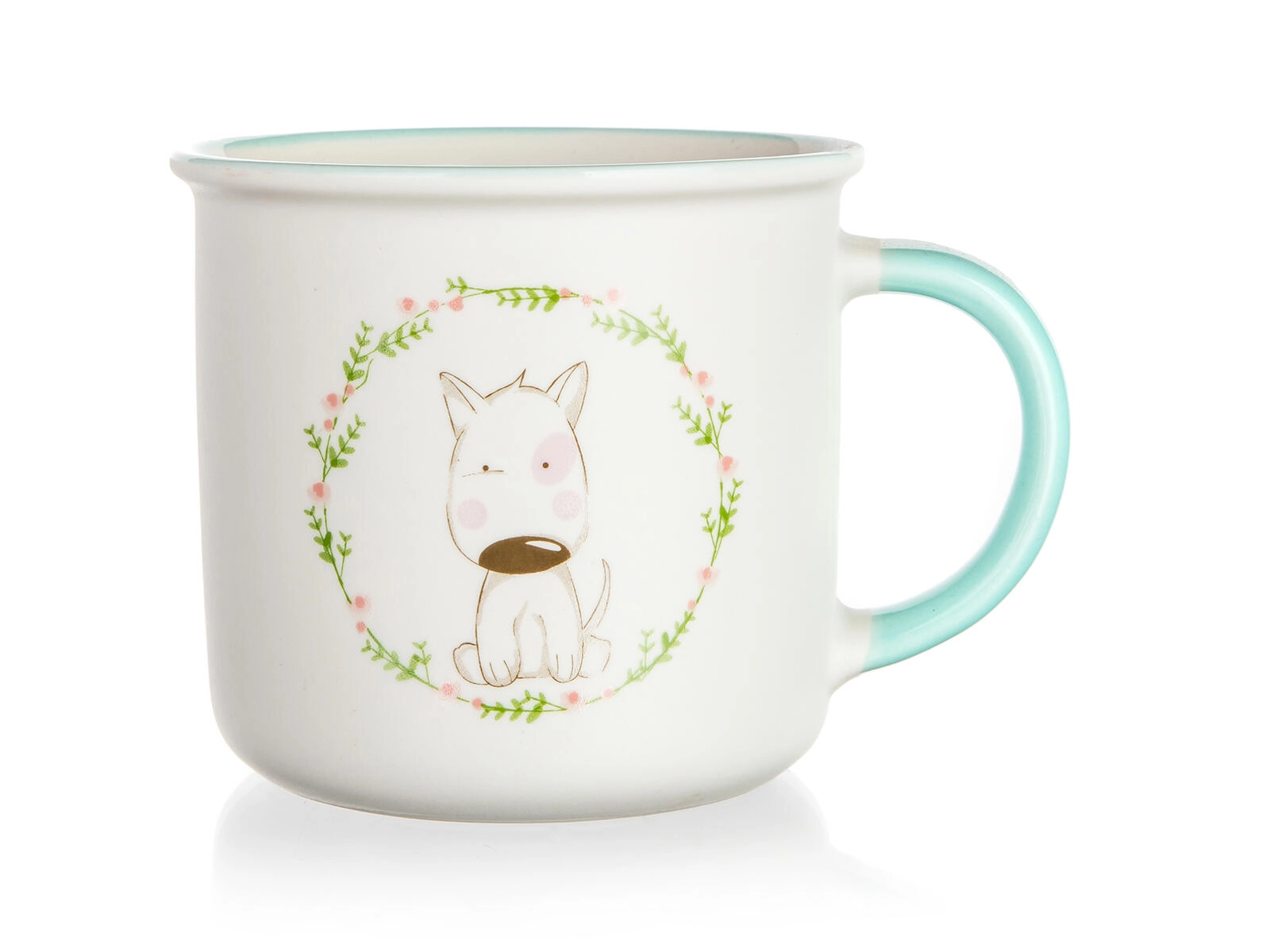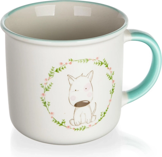 Dekor s pejskem v jemném květinovém věnci dodá vaší pauze na kávu radost i styl a potěší děti i dospělé.