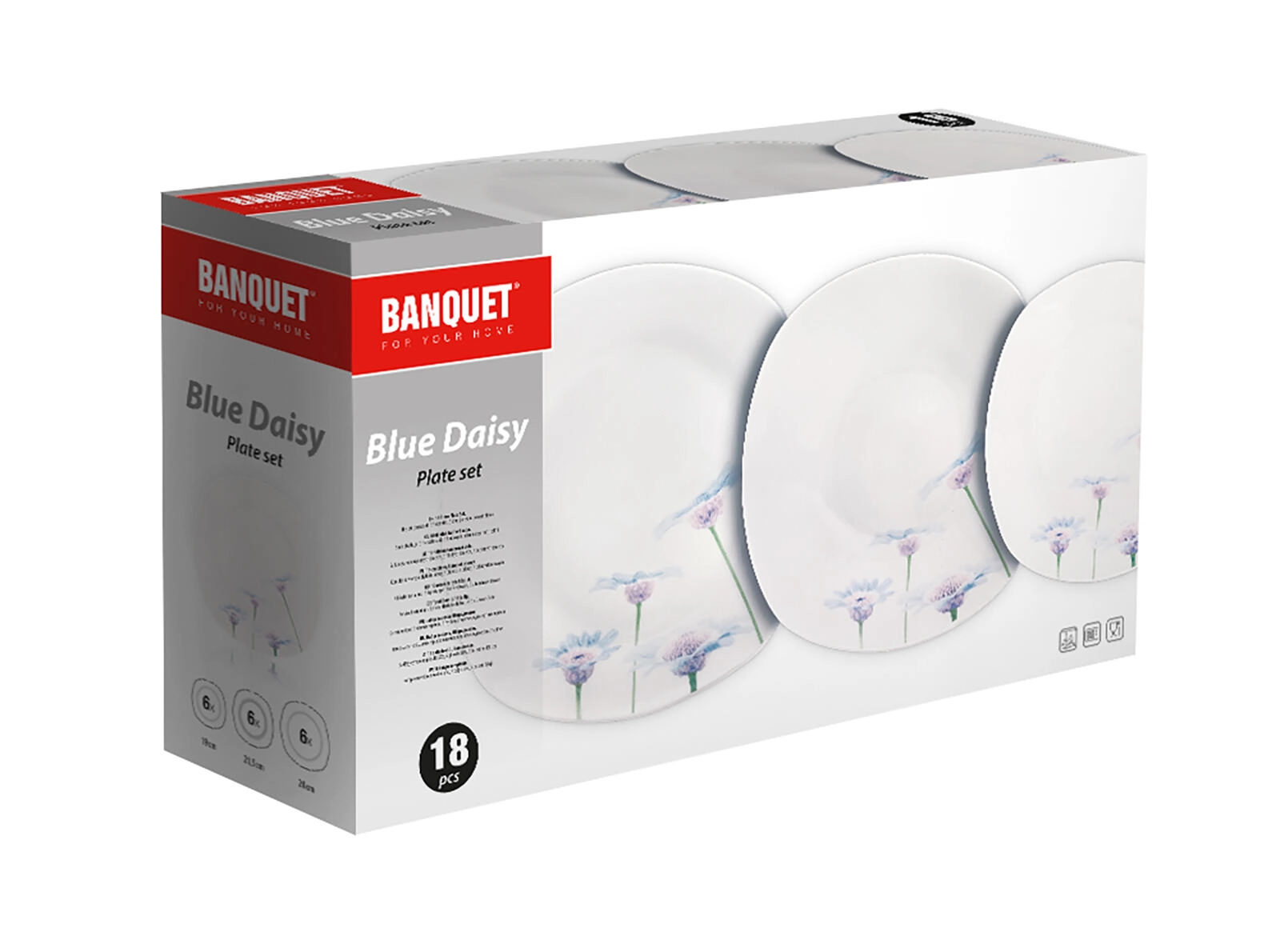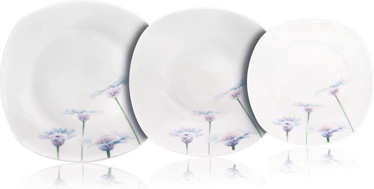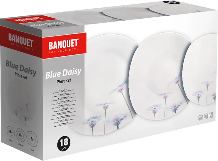 Elegantní 18dílná porcelánová jídelní sada s jemným květinovým dekorem Blue Daisy rozzáří každý stůl. Díky univerzálním velikostem talířů a odolné glazuře je ideální pro každodenní použití i sváteční stolování. Talíře mají moderní zaobleně čtvercový tvar, jsou vhodné do mikrovlnné trouby a lze je mýt v myčce.