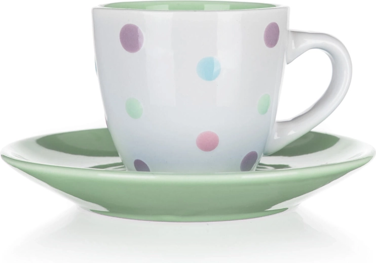 Kombinace bílého šálku s vícebarevnými puntíky a sladěného podšálku rozzáří každý kávový rituál a skvěle zapadne do moderní i vintage kuchyně.