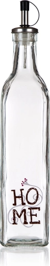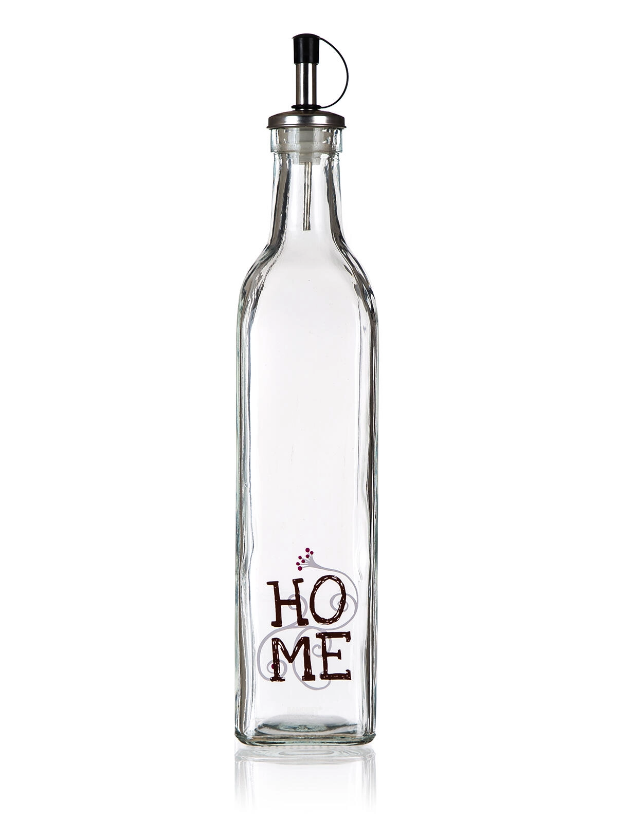 Praktická skleněná láhev na olej o objemu 500 ml s dekorem HOME usnadní dávkování i skladování oleje. Díky kovové nálevce s plastovým uzávěrem a těsněním naléváte přesně, čistě a bez kapání.