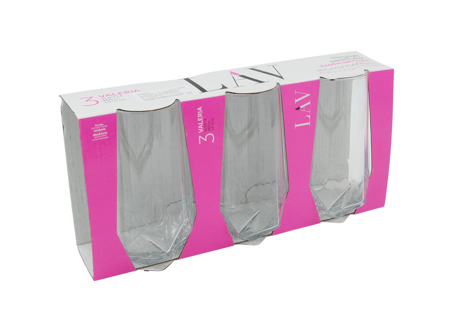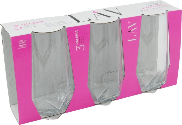 Elegantní univerzální sklenice VALERIA o objemu 460 ml v praktické sadě 3 ks jsou ideální pro každodenní použití i slavnostní příležitosti. Díky čirému sklu, vysokému tvaru a štíhlému hornímu průměru 6,3 cm skvěle vynikne servírovaný nápoj. Výška 14 cm zajišťuje pohodlné držení a moderní vzhled.