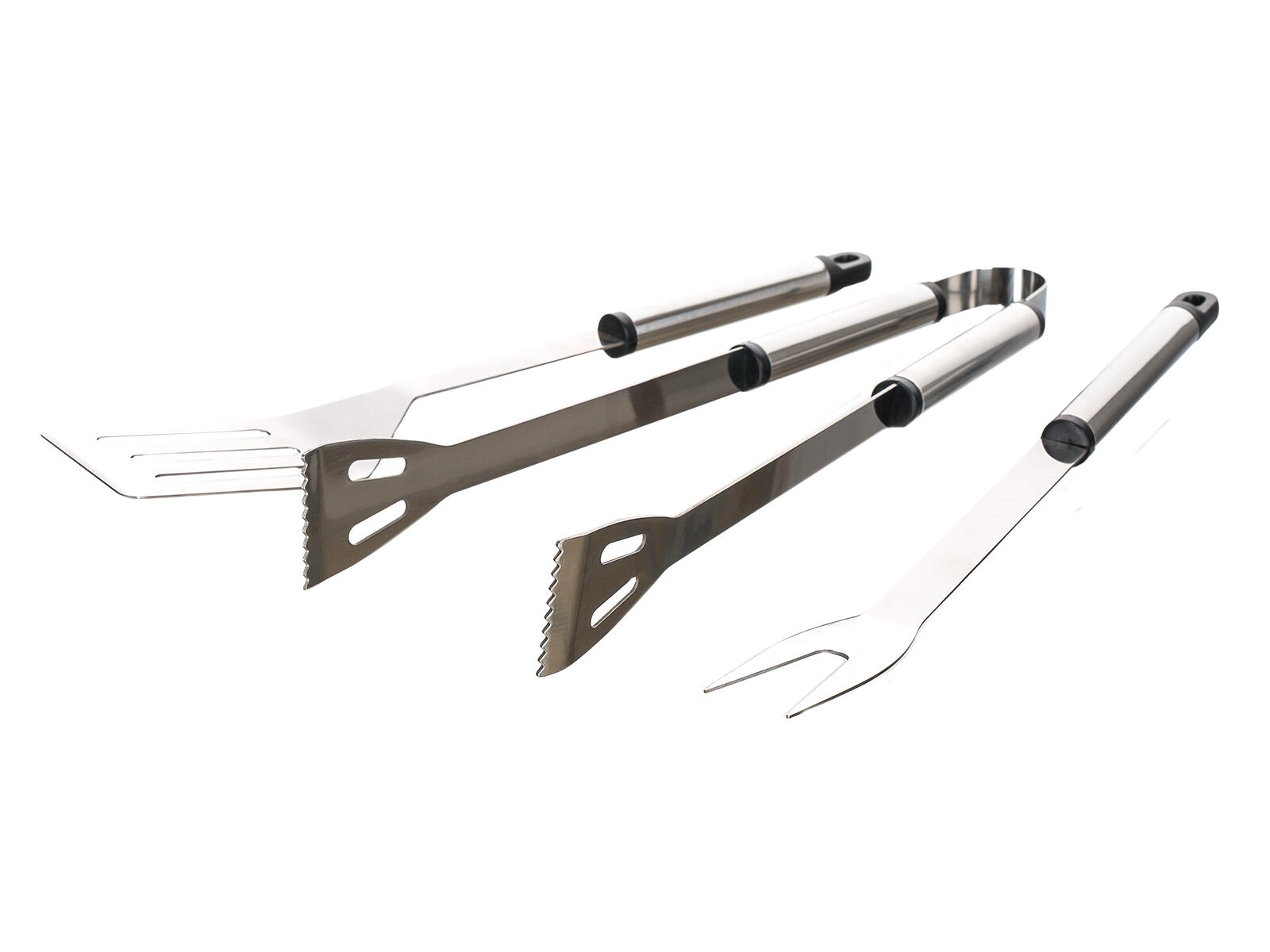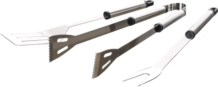 Praktická grilovací sada ze nerezové oceli obsahuje tři základní nástroje: kleště, obracečku a vidličku. Odolné provedení a očka pro zavěšení zajistí pohodlné použití i snadné uložení u každého grilu.