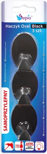 Praktická sada tří samolepicích oválných háčků v elegantní černé barvě z odolné oceli. Díky silné lepicí vrstvě zajistí rychlou montáž bez vrtání a spolehlivé držení na hladkých površích. Ideální pro klíče, utěrky, ručníky i kabely v kuchyni, koupelně či předsíni.