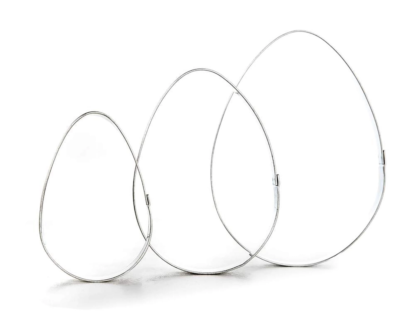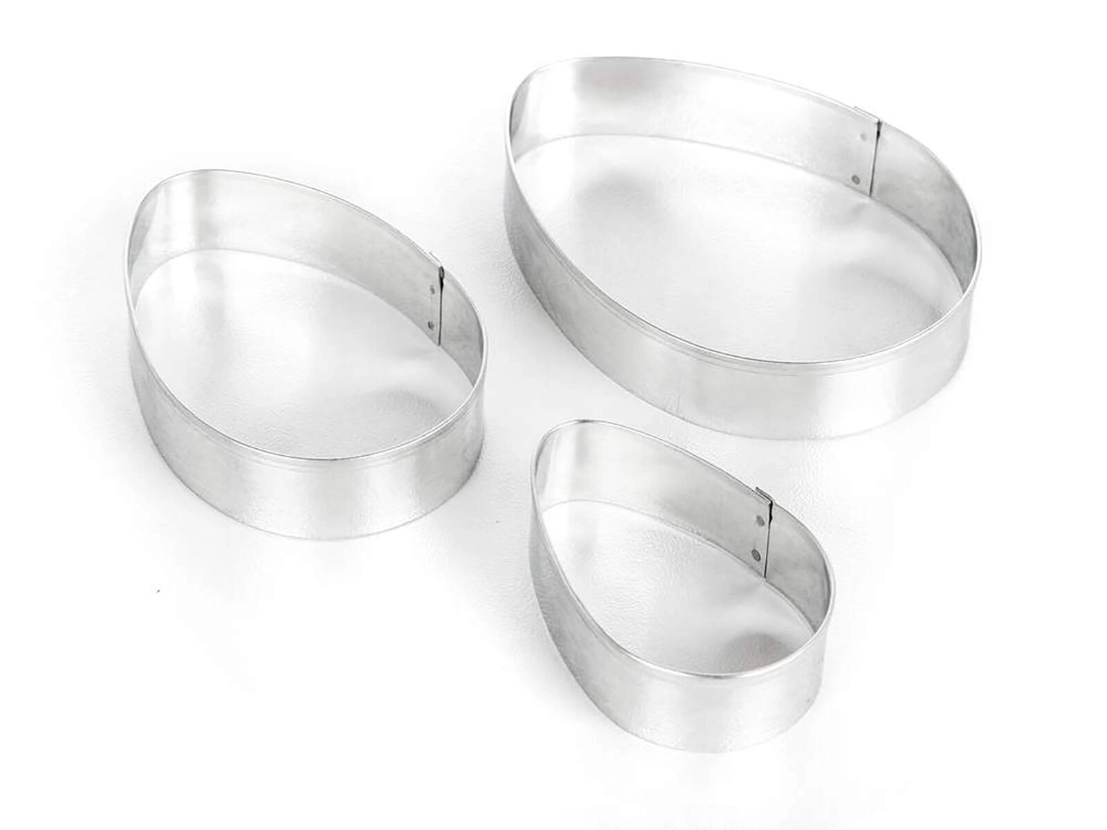 Praktická sada 3 vykrajovátek ve tvaru vejce pro snadné pečení velikonočního i celoročního cukroví. Odolný pocínovaný plech zajistí čistý řez a dlouhou životnost, tři velikosti umožní kreativní zdobení i vrstvení tvarů.