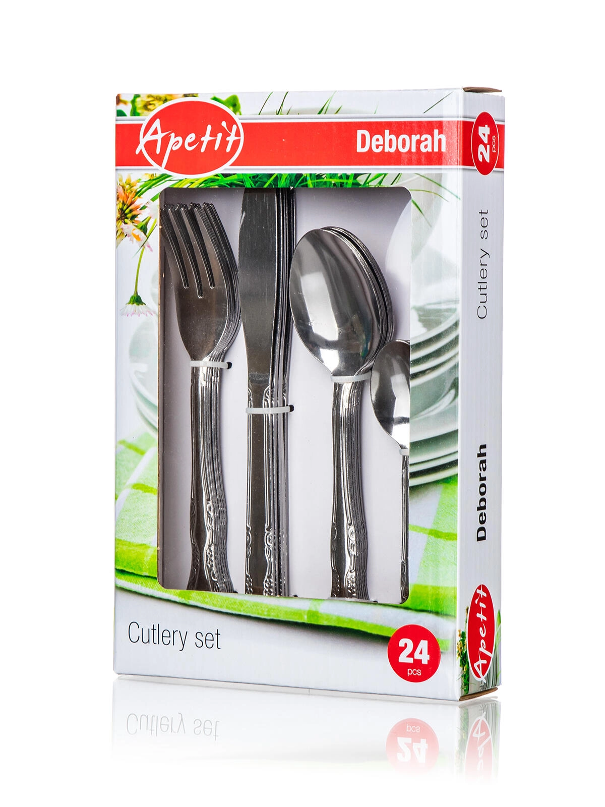 Sada příborů APETIT Deborah vyniká nadčasovým dekorem rukojetí a spolehlivou kvalitou nerezové oceli. Je ideální do domácnosti, na chatu i pro hosty – vše sladěné v jednotném designu pro perfektně prostřený stůl.