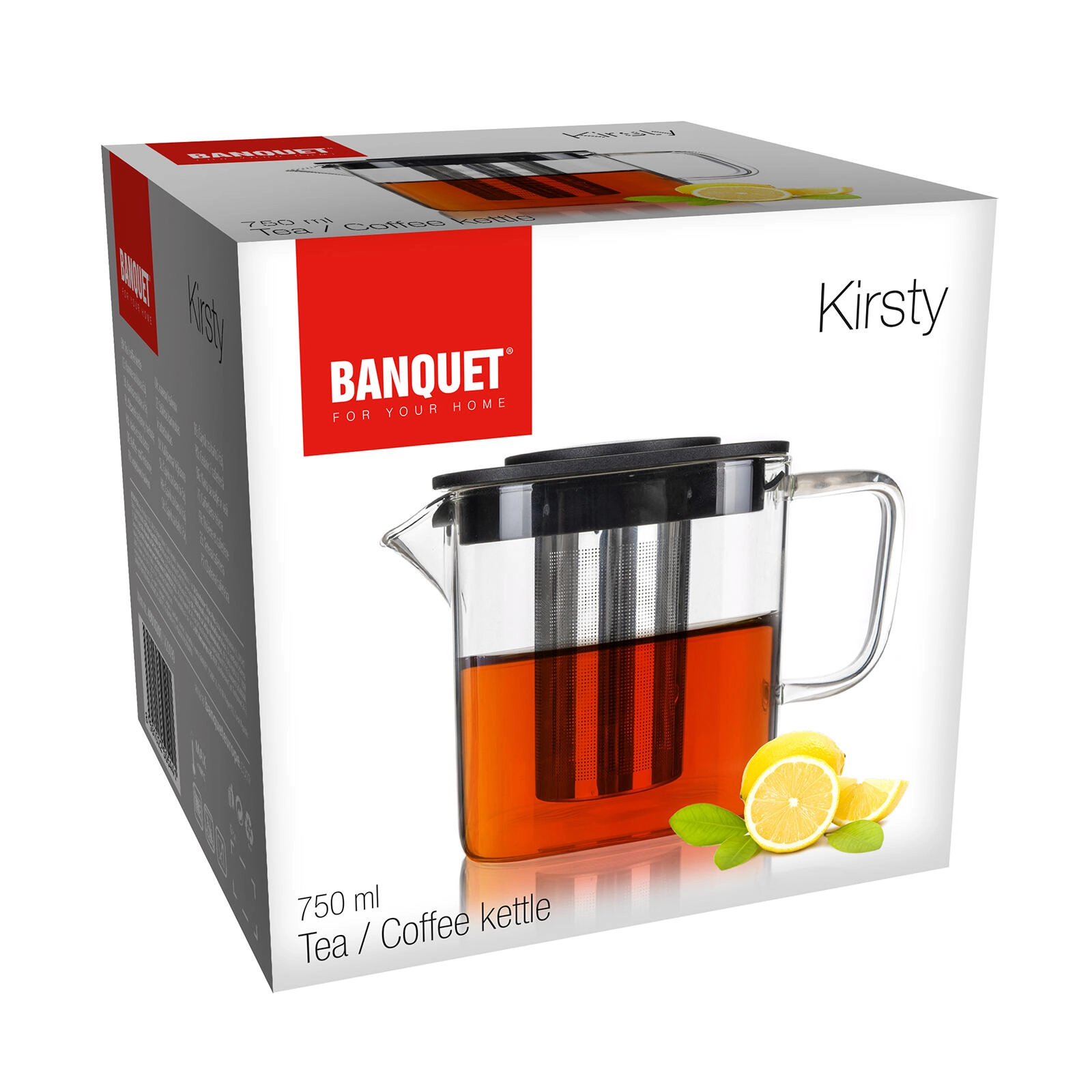Elegantní skleněná konvice KIRSTY o objemu 0,75 l se nerezovým sítkem je ideální pro přípravu sypaných čajů, kávy i domácích limonád. Díky čirému sklu snadno kontrolujete louhování, jemné sítko zachytí i drobné čajové lístky a pohodlné skleněné ucho zajistí bezpečné nalévání. Víčko z odolného plastu dobře sedí a sklo odolá teplotám až 100 °C.