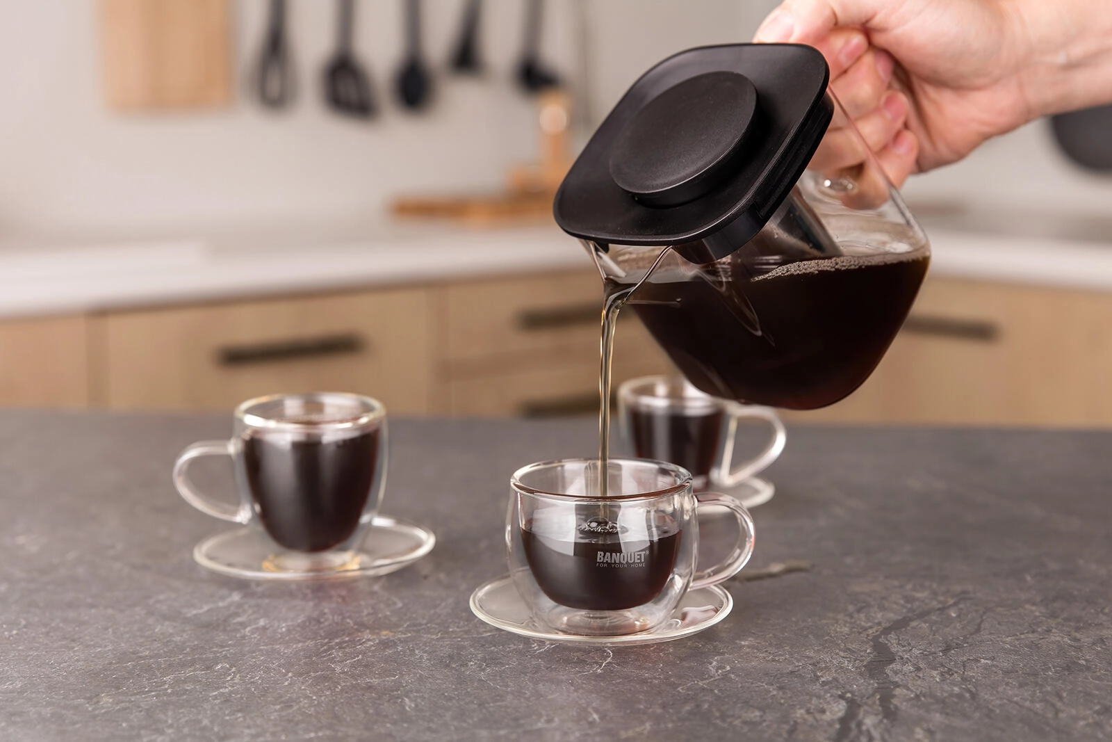 Ergonomická skleněná rukojeť a tvarovaná hubička zajišťují plynulé a přesné servírování horkých i studených nápojů.