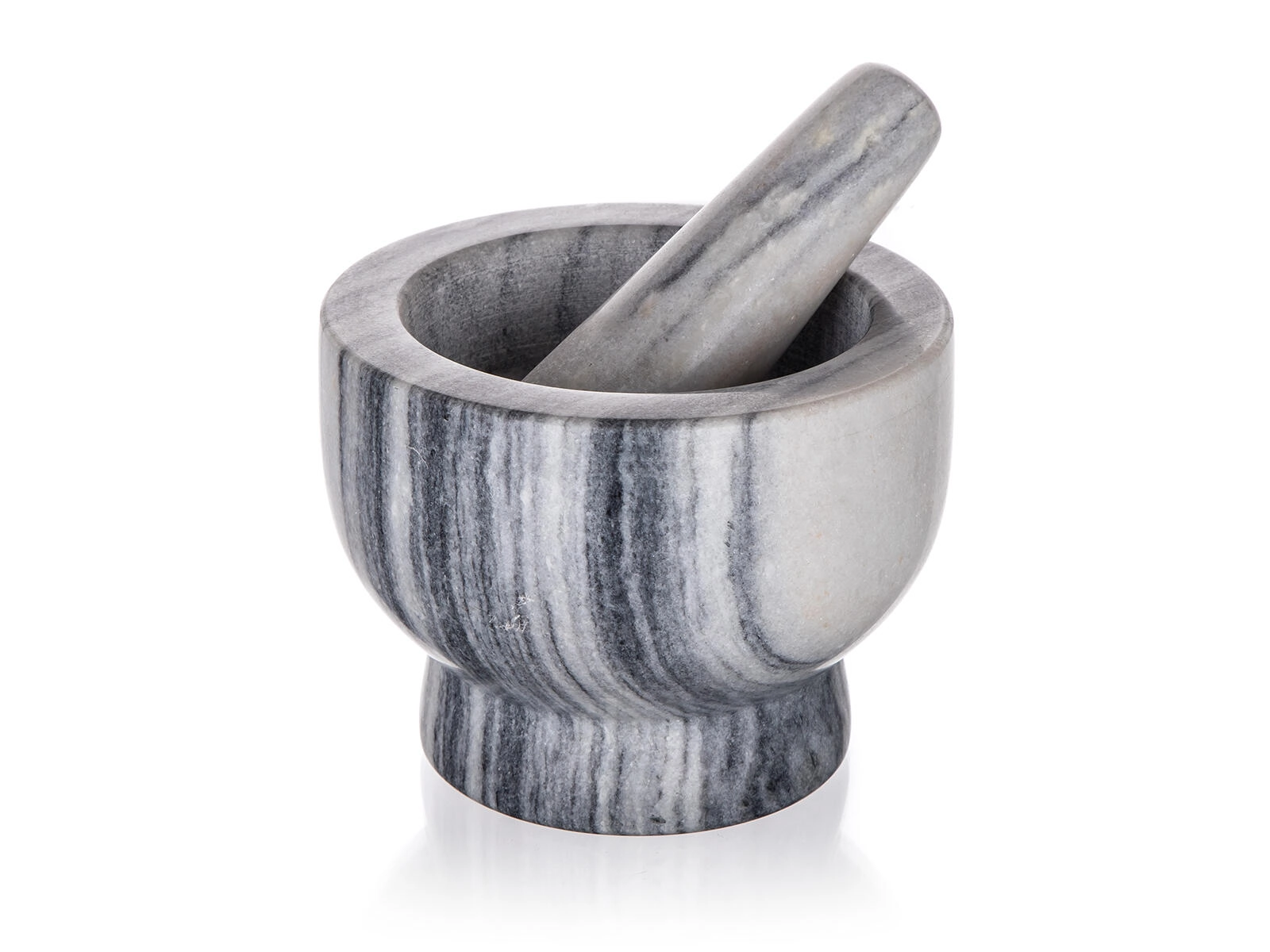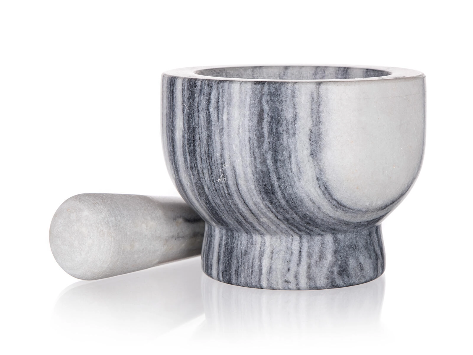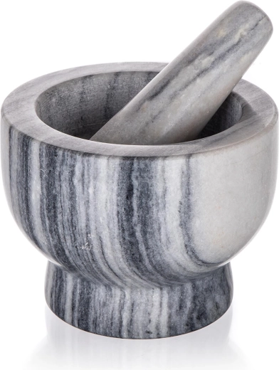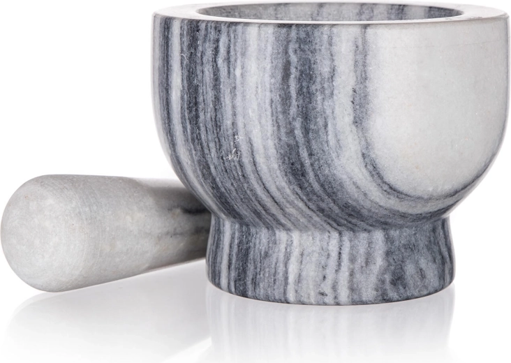 Hmoždíř je skvělý pro výrobu pesta, past a kořenících směsí. Díky nadčasovému vzhledu z mramoru se hodí do každé kuchyně a stane se jak praktickým pomocníkem, tak dekorativním prvkem na pracovní desce.