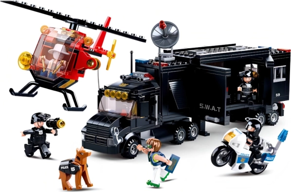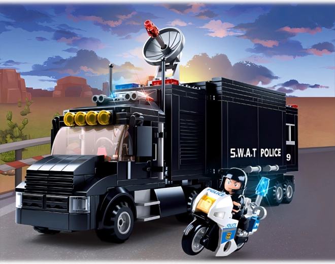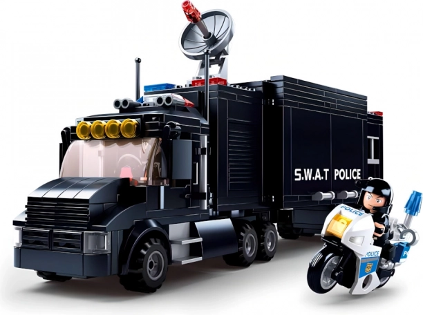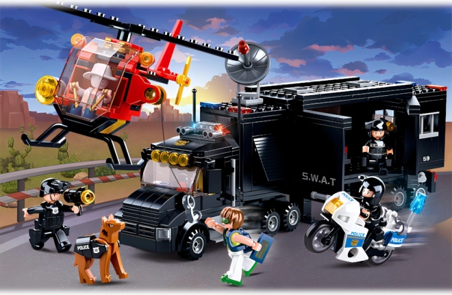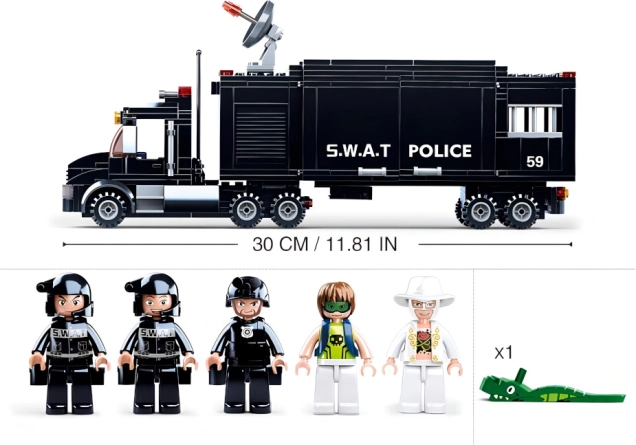 Dominantou setu je černý SWAT kamion – mobilní základna s realistickými detaily, která slouží jako centrála pro všechny policejní akce. Ideální pro taktické přesuny a plánování zásahů.