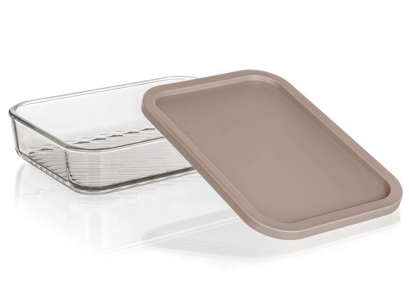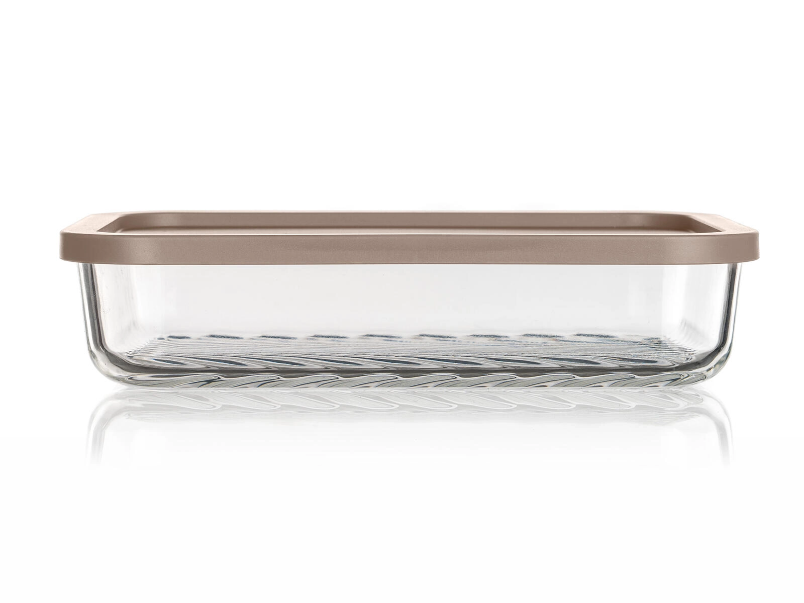 Obdélníkový formát 22,5 × 16 × 5 cm šetří místo v lednici a mrazáku. Čiré sklo s rýhovaným dnem zvyšuje stabilitu a usnadňuje kontrolu obsahu.