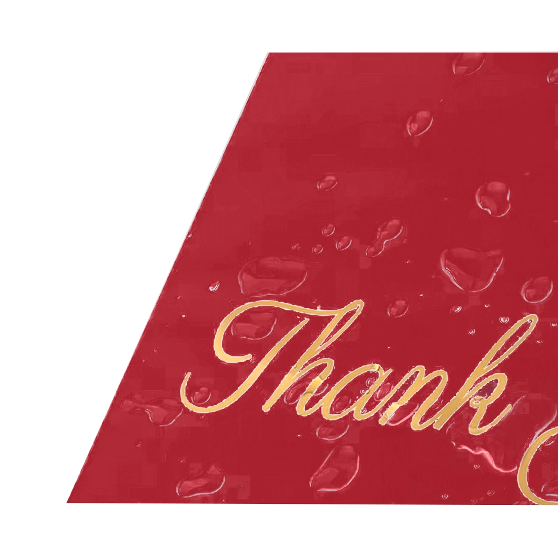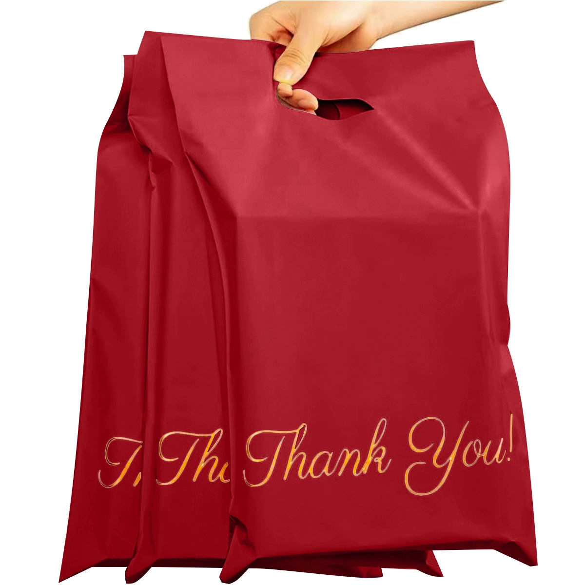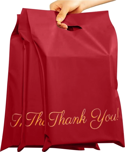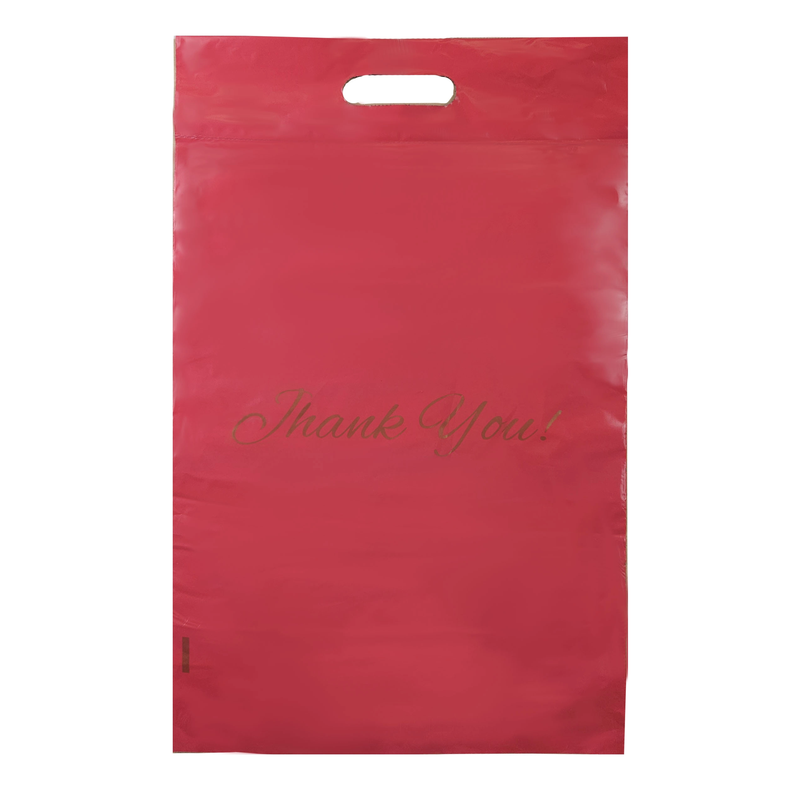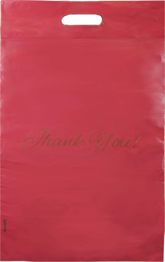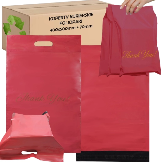 Praktické a odolné kurýrní plastové obálky s výřezovým uchem v elegantní červené barvě pro pohodlné doručení zásilek. Vyrobené z pevné LDPE folie chrání obsah před vlhkostí, prachem a poškozením. Samolepicí pásek zajistí bezpečné uzavření a rychlé balení. Balení obsahuje 50 ks ve velikosti 400 × 500 + 70 mm (ucho) s dekorativním nápisem Thank You.