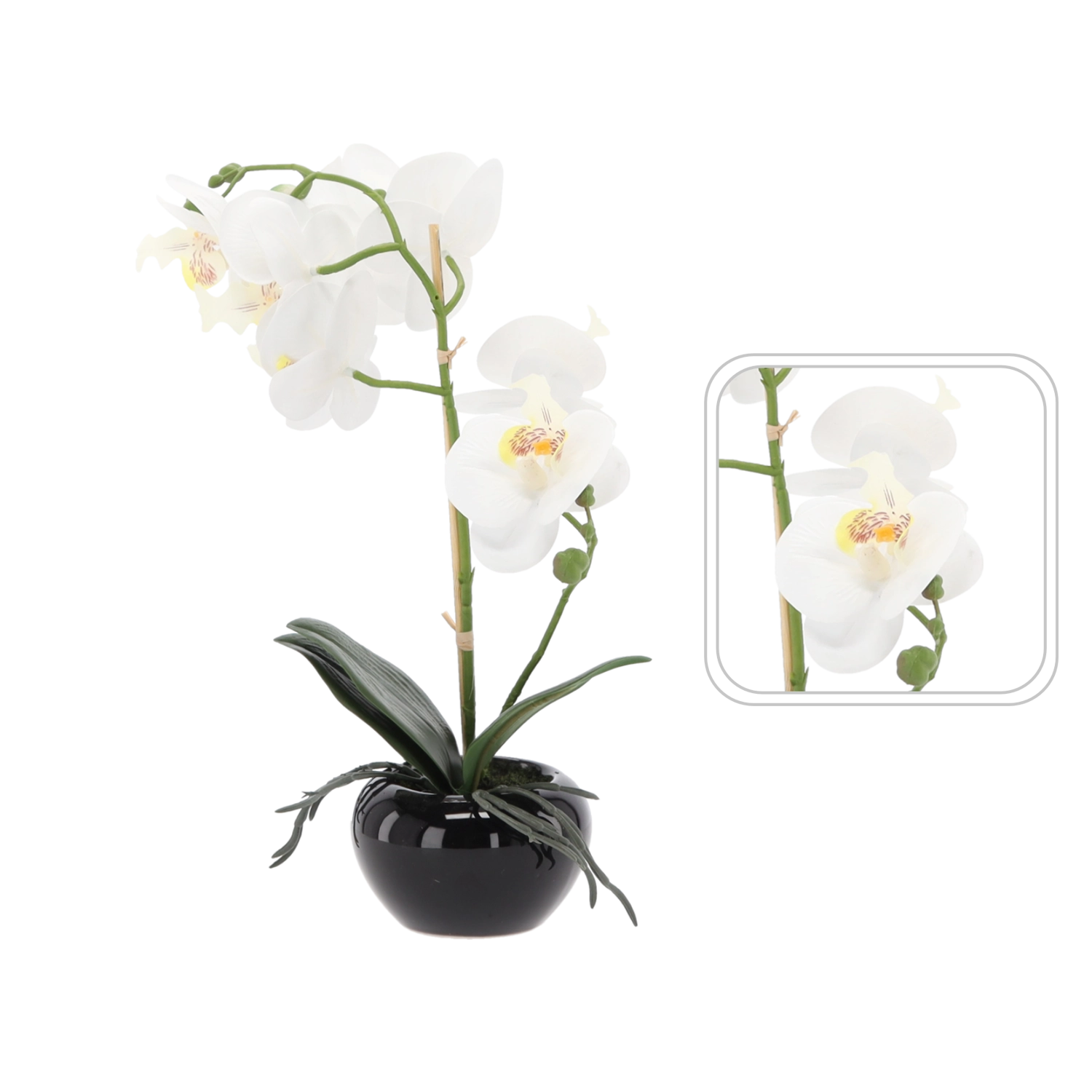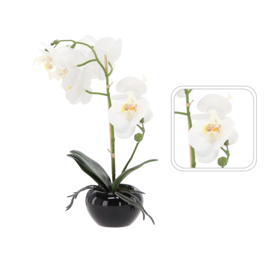 Tato umělá bílá orchidej vyniká realistickými detaily a kompaktní výškou 30 cm, díky níž se snadno umístí na menší plochy. Je skvělou volbou pro ty, kteří chtějí dopřát svému prostoru svěží vzhled bez nutnosti pravidelného zalévání či speciálních podmínek.
