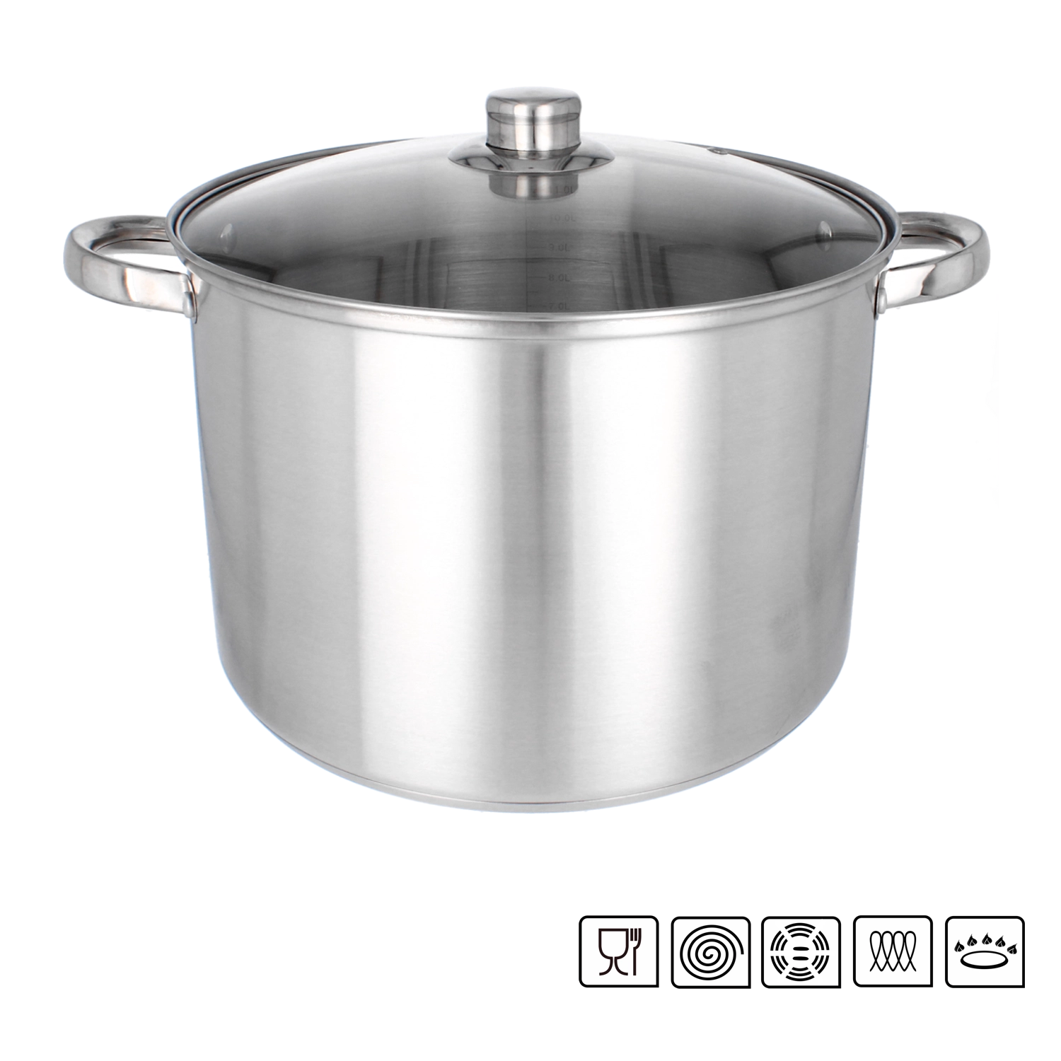 Robustní nerezový hrnec o objemu 14 l a průměru 30 cm s indukčním vícevrstvým dnem pro rychlý a rovnoměrný ohřev. Vyroben z oceli S/S 201 o tloušťce 0,5 mm, nabízí vysokou odolnost proti korozi a dlouhou životnost. Součástí je skleněná poklice, pevné nerezové rukojeti a praktická vnitřní odměrná stupnice pro snadné dávkování.