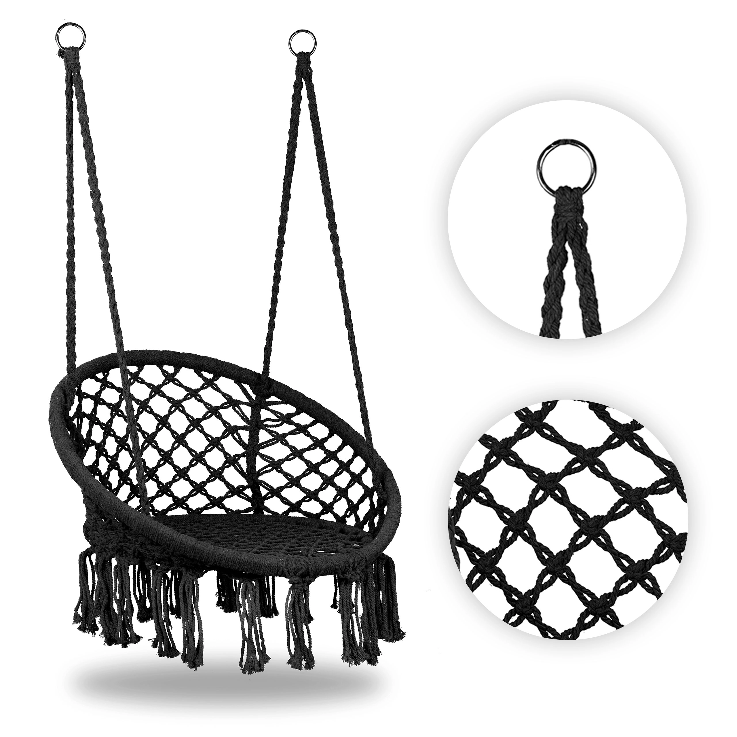 Dva pevné plechové kroužky a spletené nosné lana umožňují jednobodové i dvoubodové uchycení na hák, trám či stojan – pro jistotu při každém houpání.