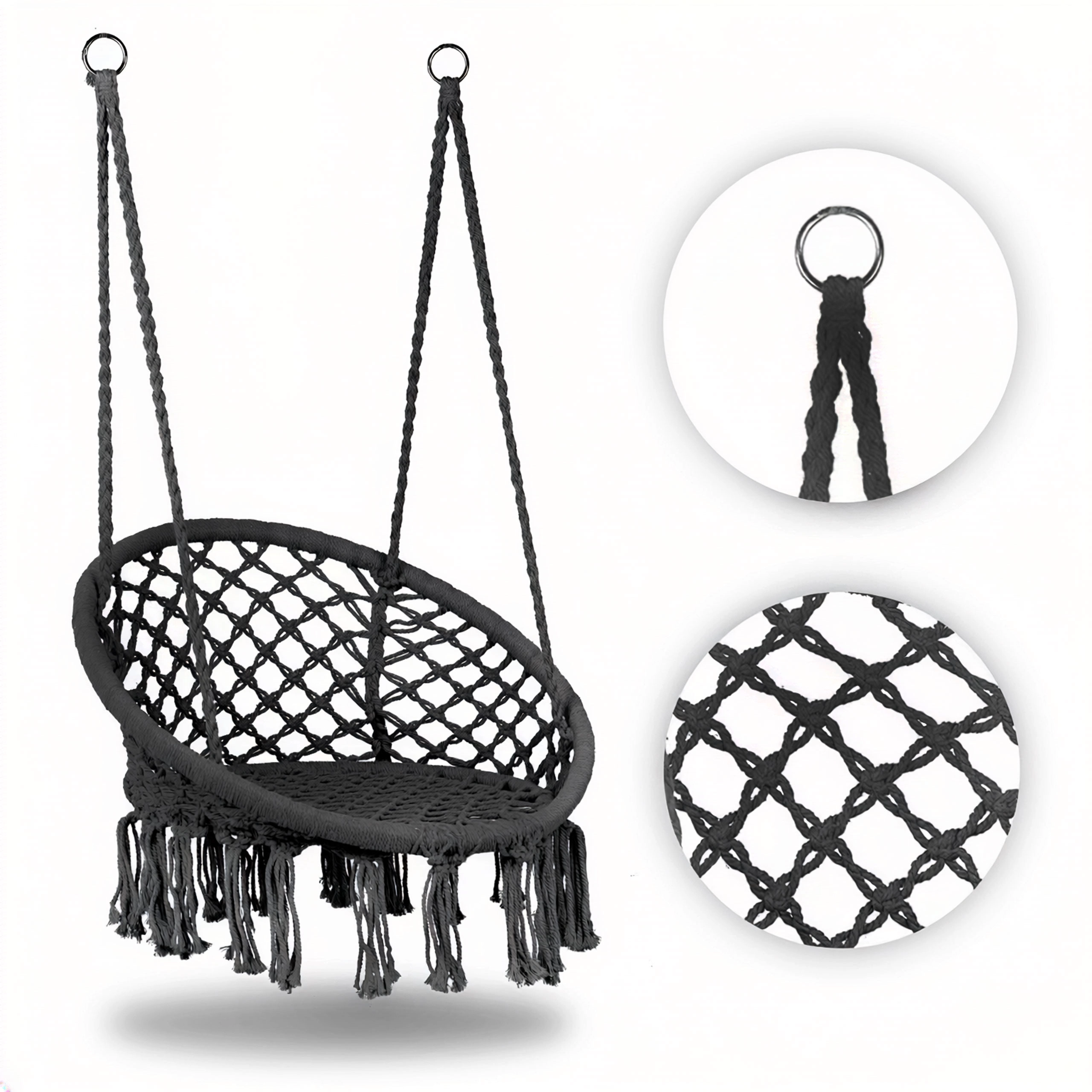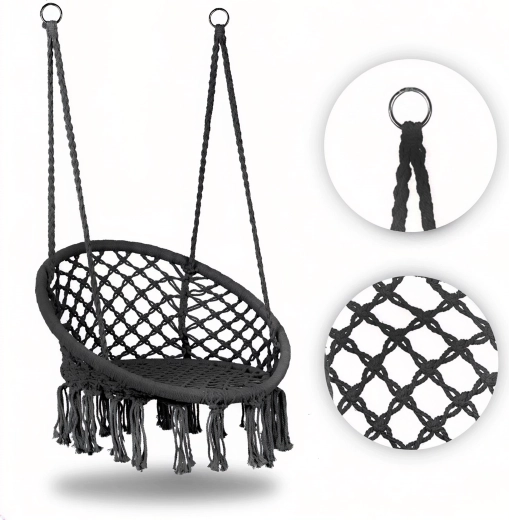 Kruhový rám z oceli (22 mm) a hustý 3mm provazový výplet zajišťují stabilitu, oporu těla a dlouhou životnost v interiéru i exteriéru.
