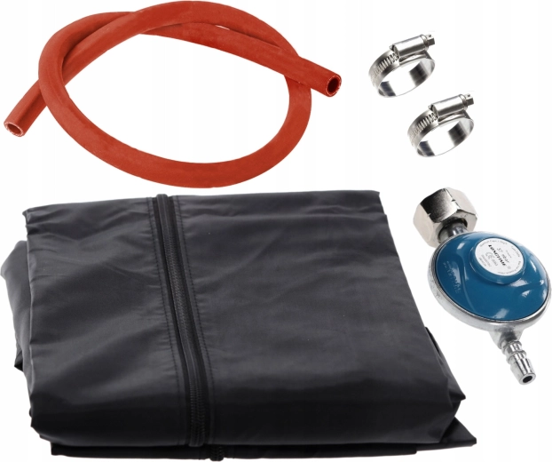 Součástí je odolný zipový kryt, plynová hadice s regulátorem a vestavěná kolečka pro pohodlné přesunutí po terase.