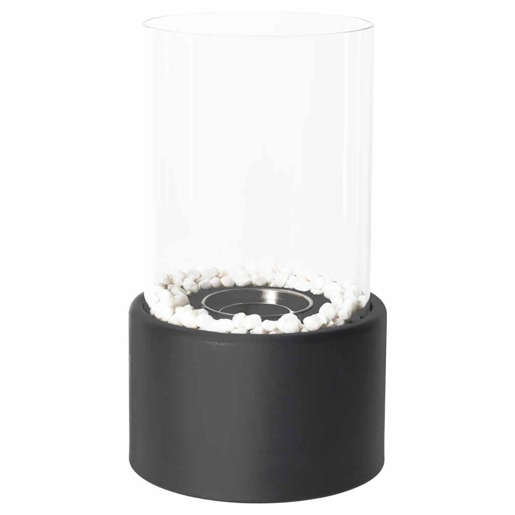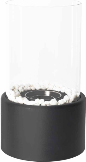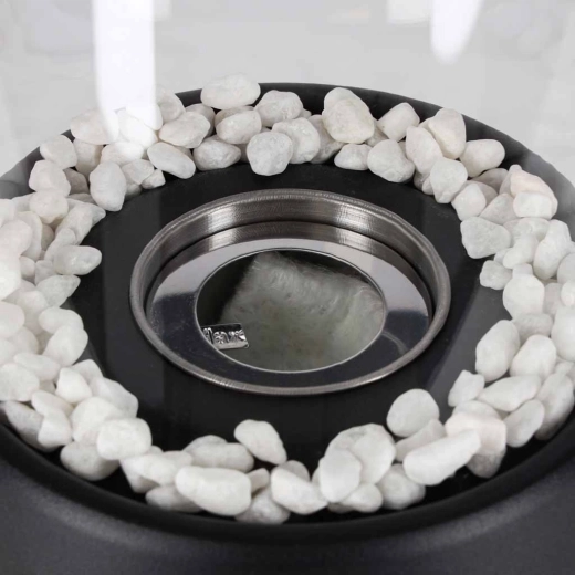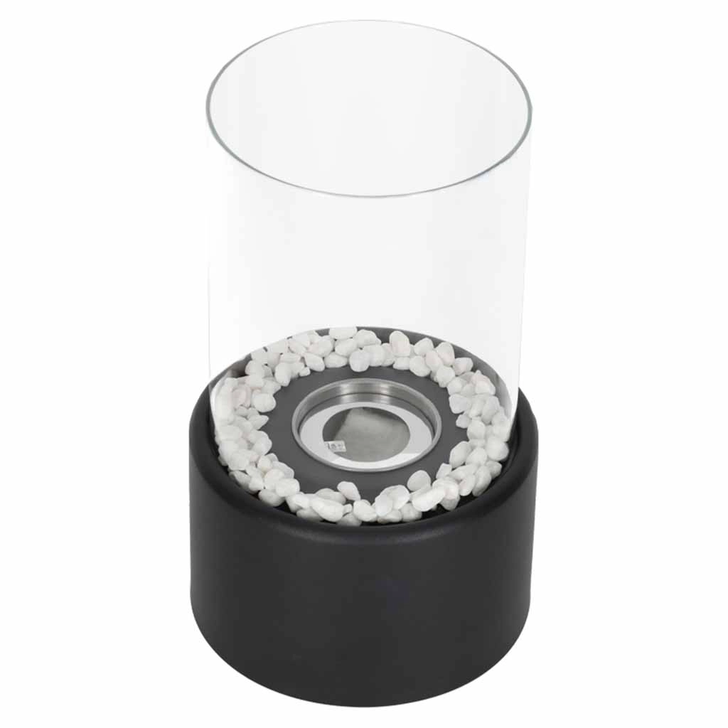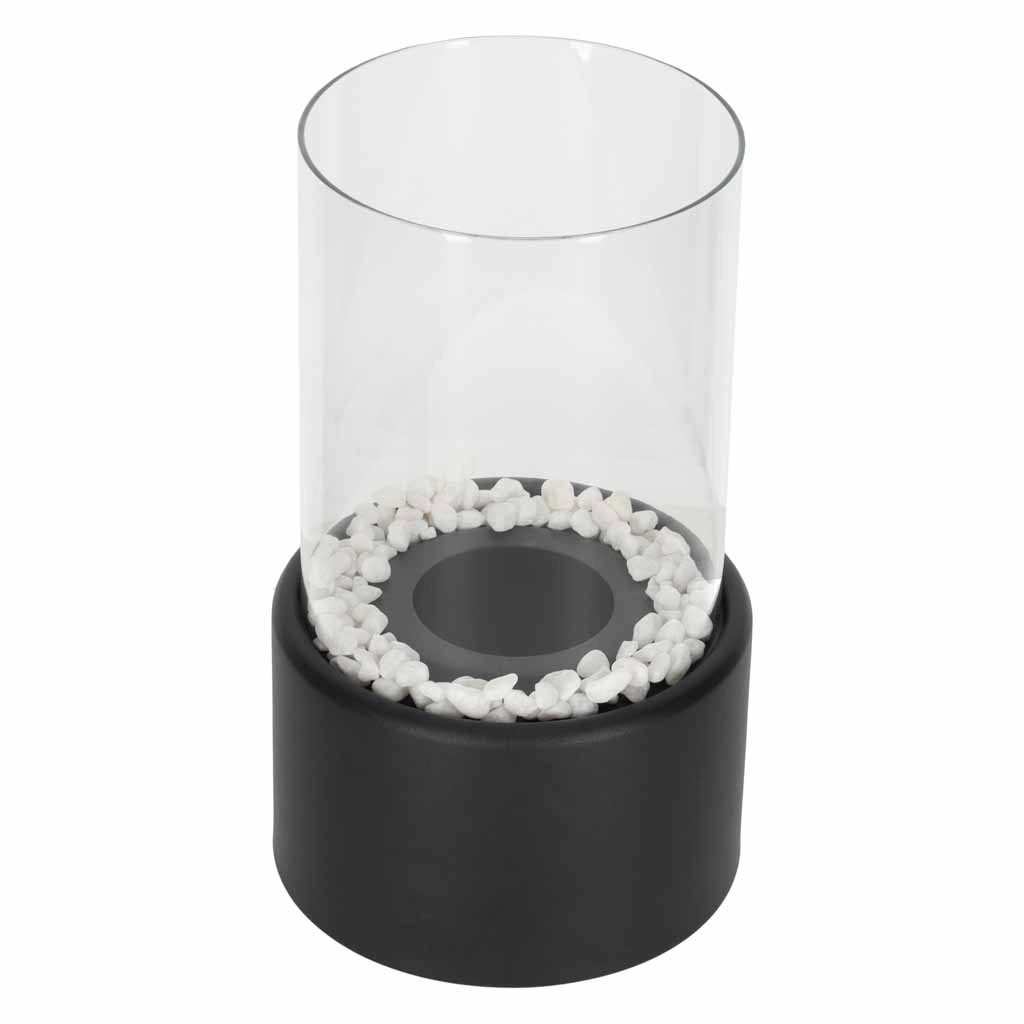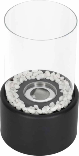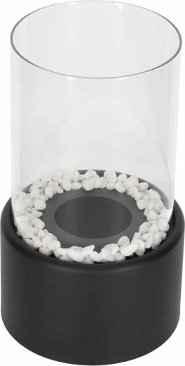 Černý minimalistický podstavec, válcové tvrzené sklo a dekorativní kamínky vytvářejí moderní doplněk, který se hodí do každého interiéru.