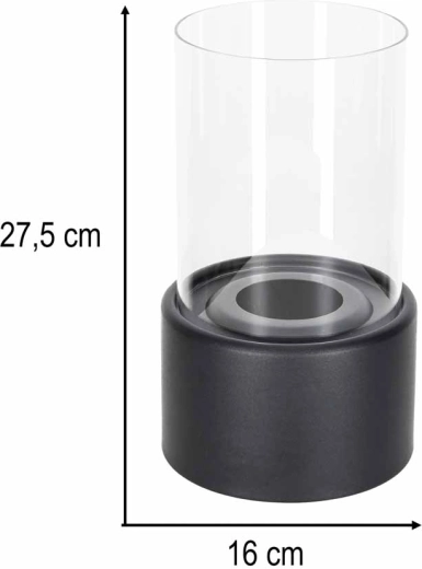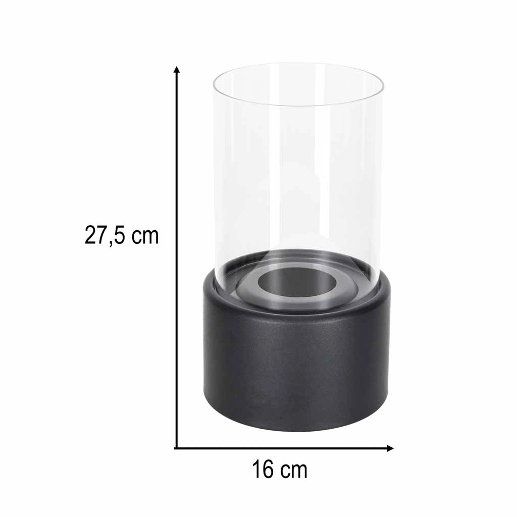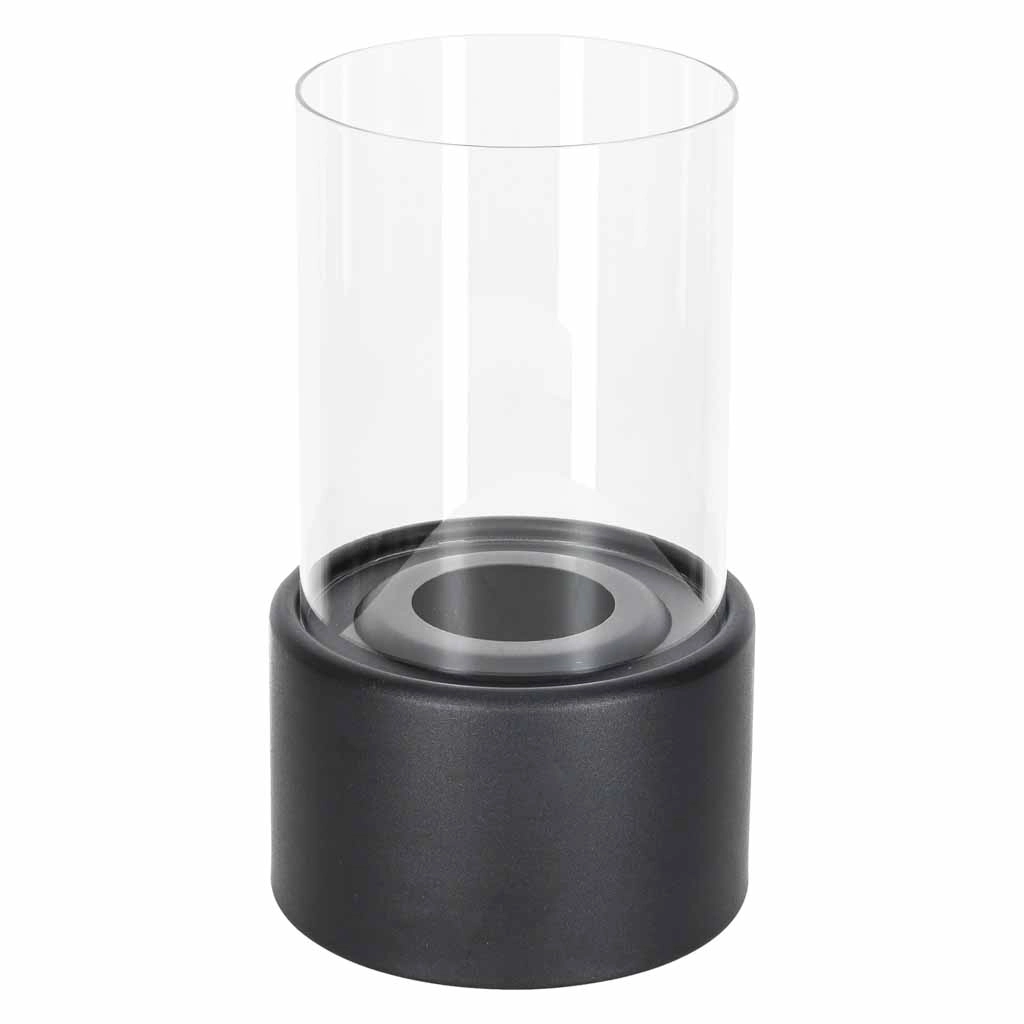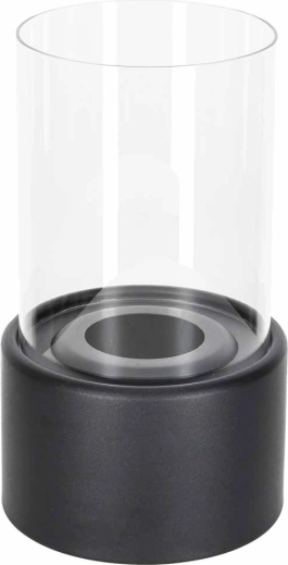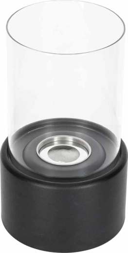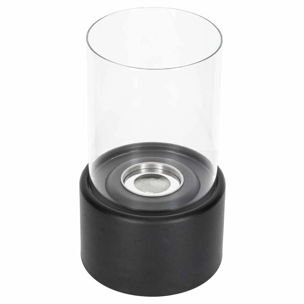 Černý minimalistický podstavec, válcové tvrzené sklo a dekorativní kamínky vytvářejí moderní doplněk, který se hodí do každého interiéru.