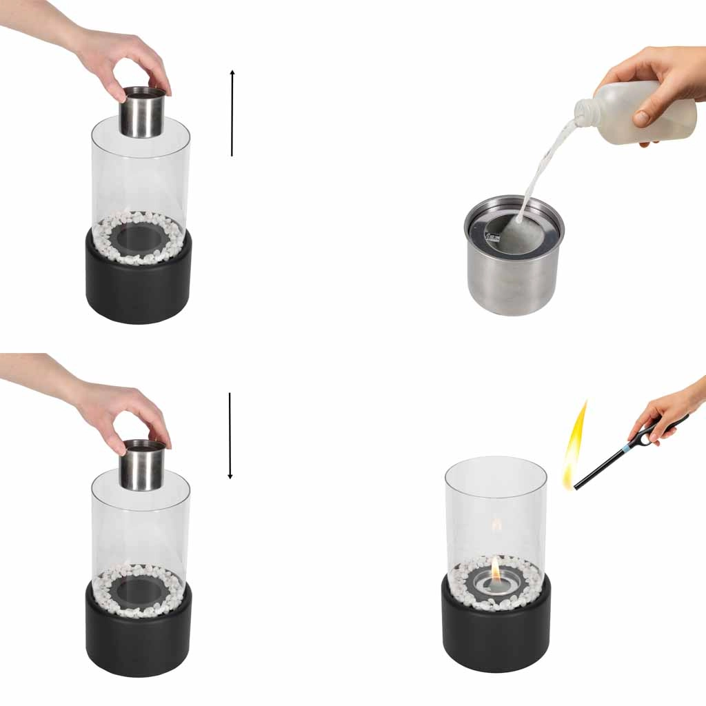 Ochranný válcový skleněný tubus z tvrzeného skla zvyšuje bezpečnost a prohlubuje efekt plamene. Kovové palivové těleso z nerezové oceli s bavlněným vláknem zajišťuje rovnoměrné hoření a jednoduché doplňování paliva. Součástí balení je praktická zhášecí pomůcka a dekorativní kamínky pro doladění vzhledu.