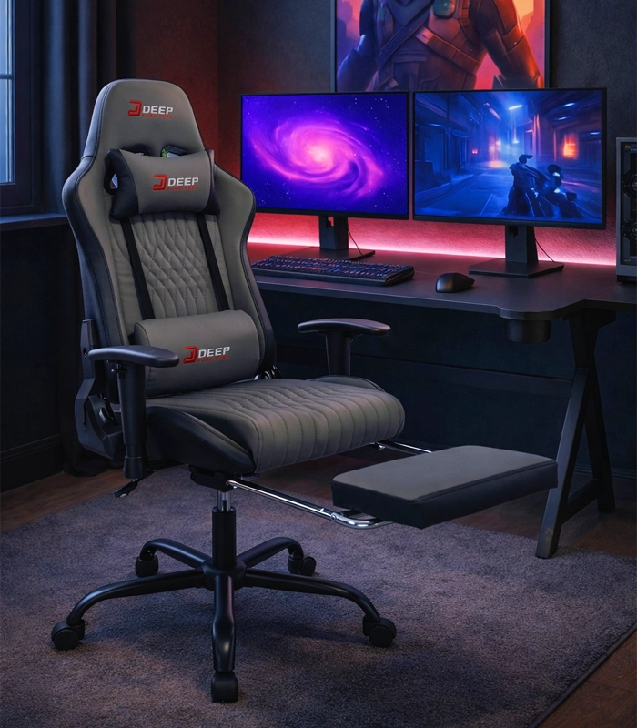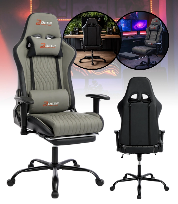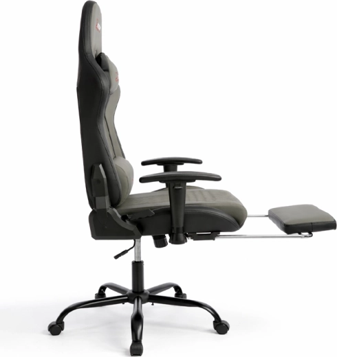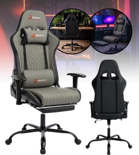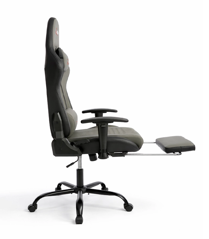 Stylové šedé herní křeslo kombinuje ergonomii, výsuvný podnožník, nastavitelnou výšku a sklopné opěradlo až 155° pro maximální pohodlí při hraní i práci. Díky polštářku pod hlavu, bederní opěrce a 2D podloketníkům nabízí stabilní podporu zad a paží. Odolné PU kožené čalounění se snadno čistí a moderní vzhled zapadne do kanceláře, studentského pokoje i herního koutku.