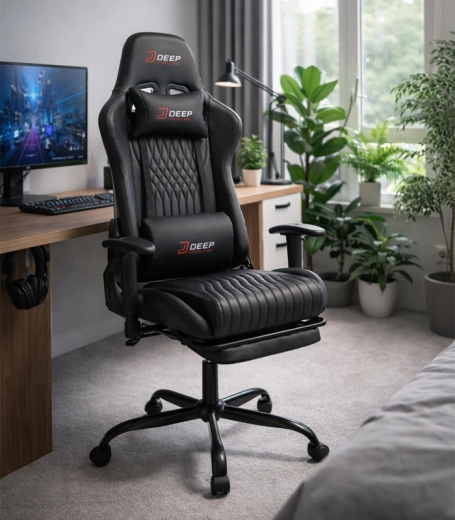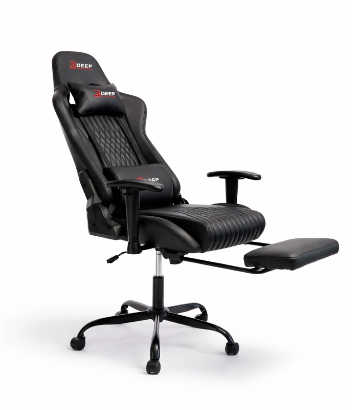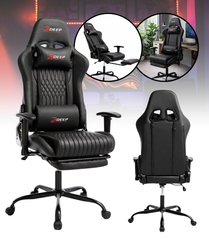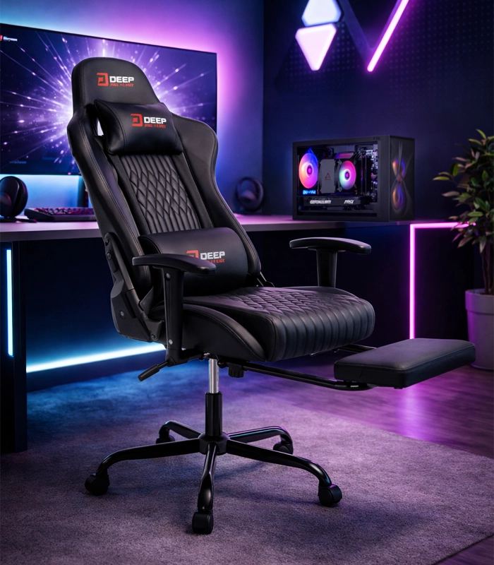 Stylová černá herní židle kombinuje ergonomický design, široké možnosti nastavení a vysoký komfort pro hraní i práci. Nabízí výsuvnou podnožku, sklápění opěradla až do 155°, 2D područky a měkké polštářky pro krk a bedra. Odolné čalounění z PU ekokůže, kovová základna a plynový píst třídy 3 zajišťují stabilitu a snadnou údržbu.