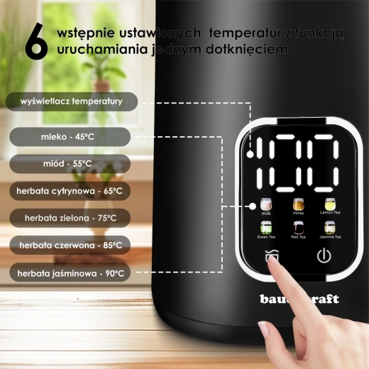 Užijte si rychlou a přesnou přípravu nápojů díky chytré konvici s dotykovým ovládáním. Přednastavené teploty umožní zvolit ideální ohřev pro různé druhy čajů, kávu, mléko či med. Dvojitá stěna zvyšuje bezpečnost, povrch je na dotek chladnější a voda déle vydrží horká. Díky objemu 1,7 l snadno obsloužíte celou rodinu.