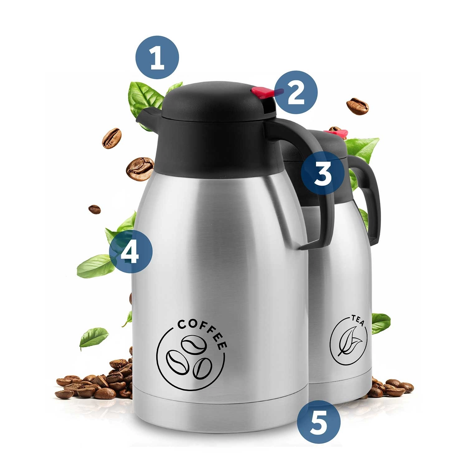 Sada obsahuje dvě termokonvice o objemu 2 l: jednu s nápisem COFFEE a druhou TEA. Ideální pro domácnost, kancelář i catering – snadno rozlišíte nápoje a servírujete bez záměny.