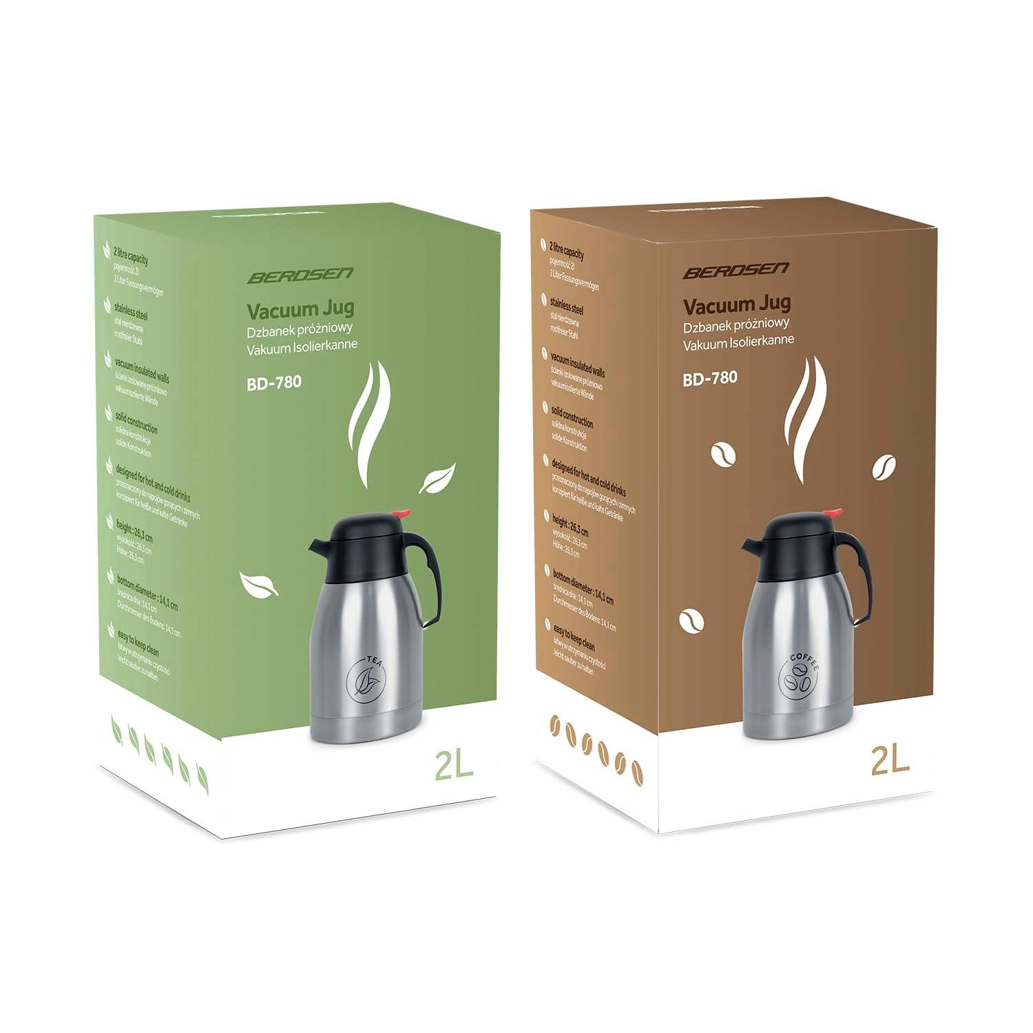 Objevte spolehlivou sadu 2 nerezových termokonvic BERDSEN BD-780 s objemem 2 000 ml každá. Moderní dvoustěnná konstrukce z nerezové oceli a technologie TermoLite™ zajišťují vynikající tepelnou izolaci – ideální na rodinné výlety, pikniky, kancelář i domácí setkání. Jedna konvice je určena na kávu, druhá na čaj, takže budete mít vždy pořádek v servírování.