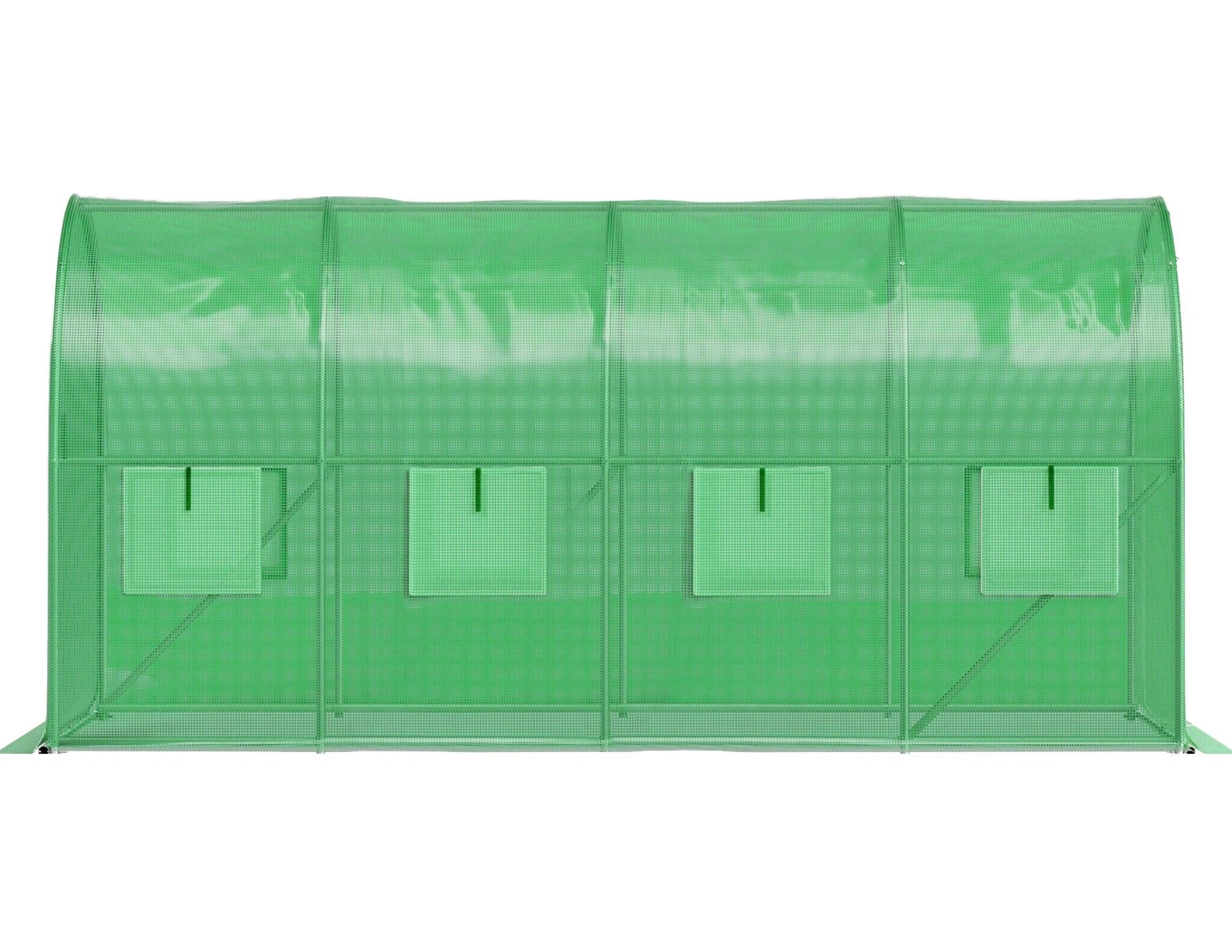 Zesílený PE potah s mřížkovou výztuží propouští světlo, zároveň chrání před UV zářením, vlhkostí a větrem. Rolovací vstup a okna se síťkou zajišťují plynulou ventilaci.