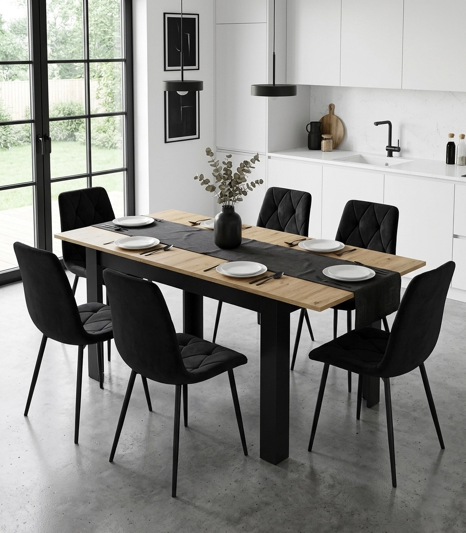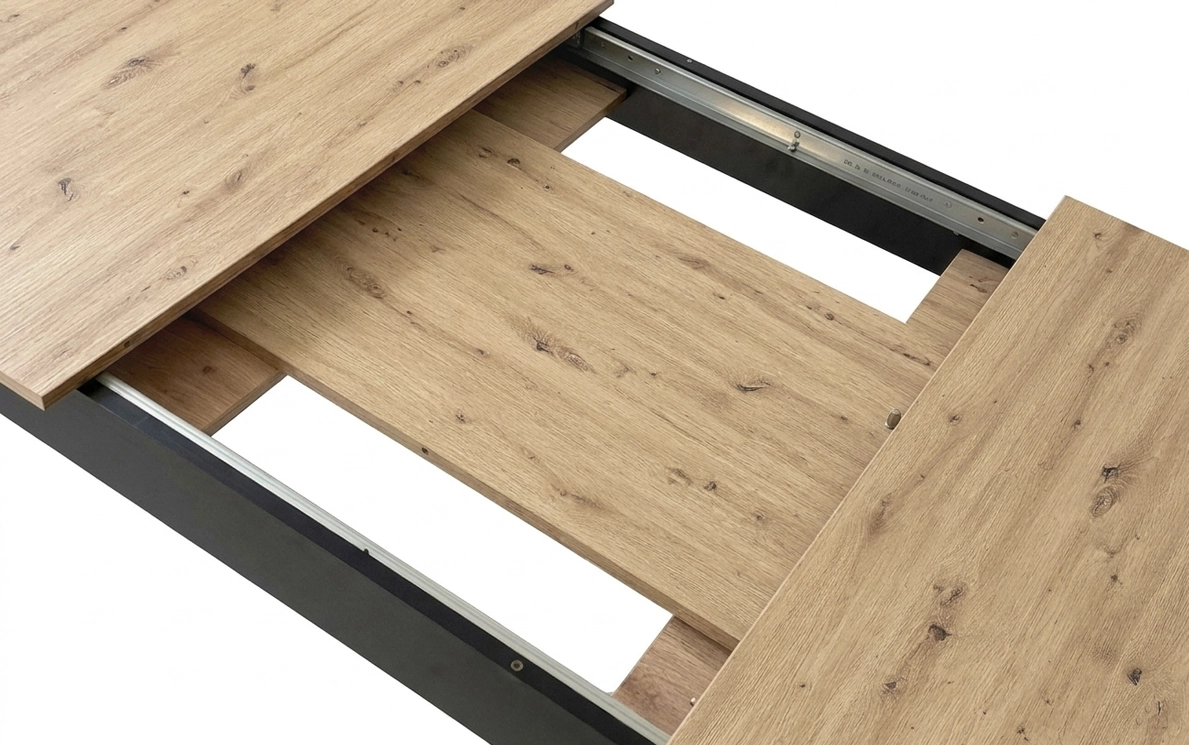 Rozšíření obstará středová vložka uložená přímo pod deskou, takže ji máte vždy po ruce a nemusíte řešit další skladování. Masivně působící nohy zajišťují pevnost a stabilitu, zatímco geometrická silueta podtrhuje moderní, loftový charakter nábytku.