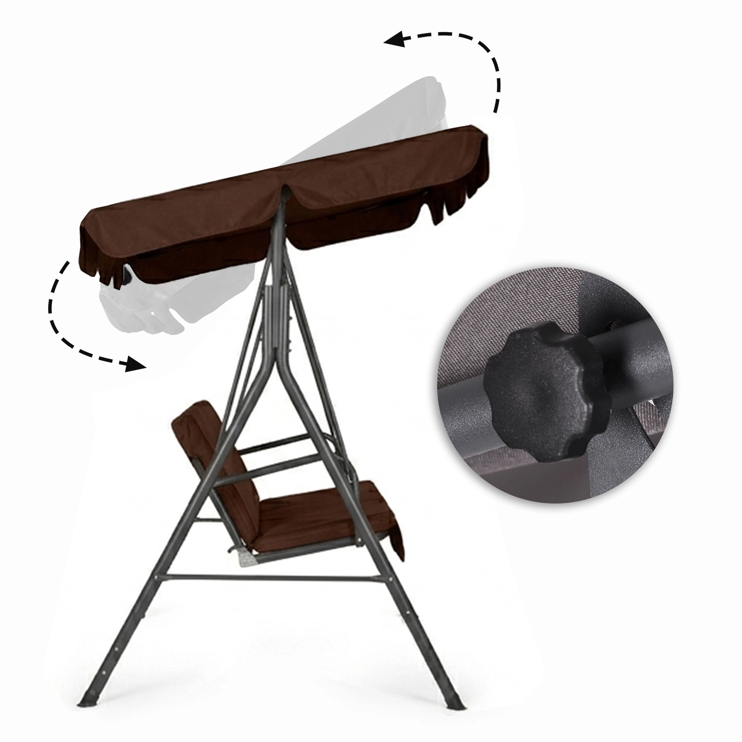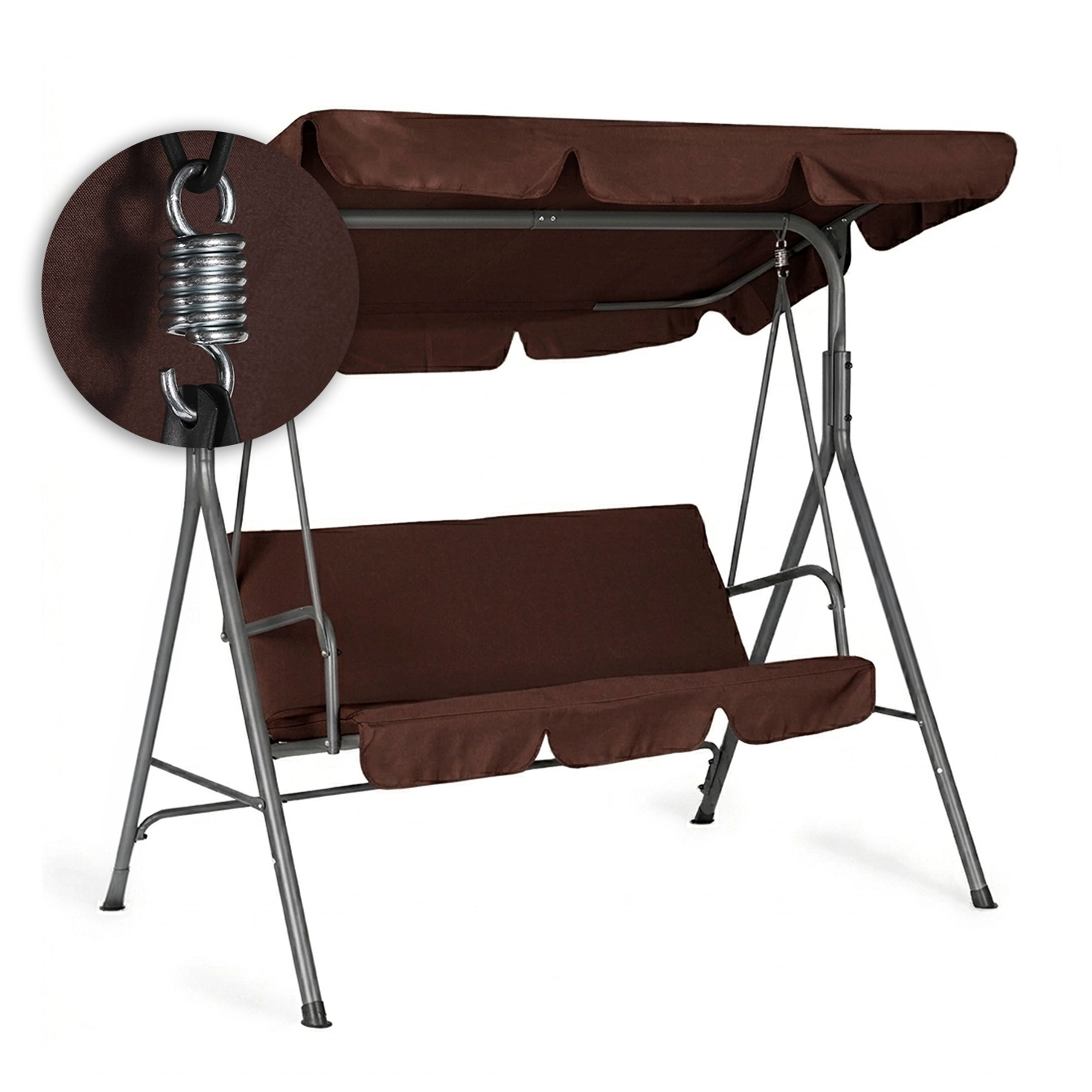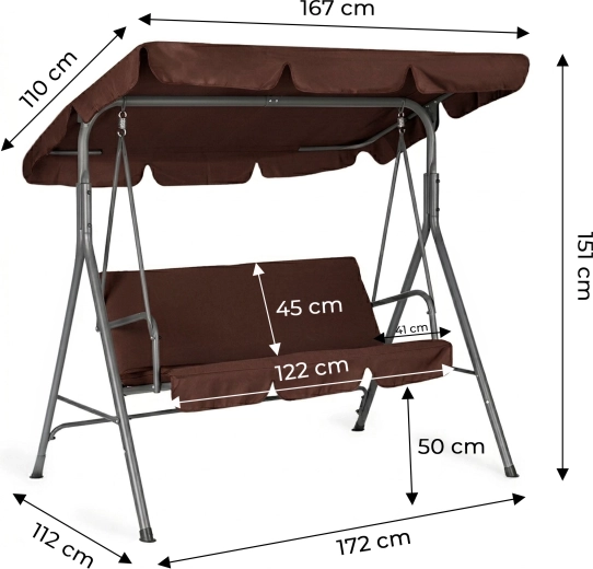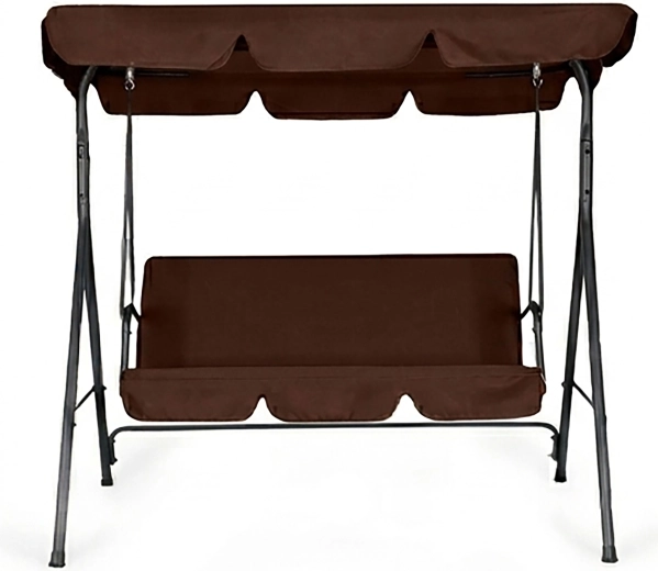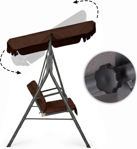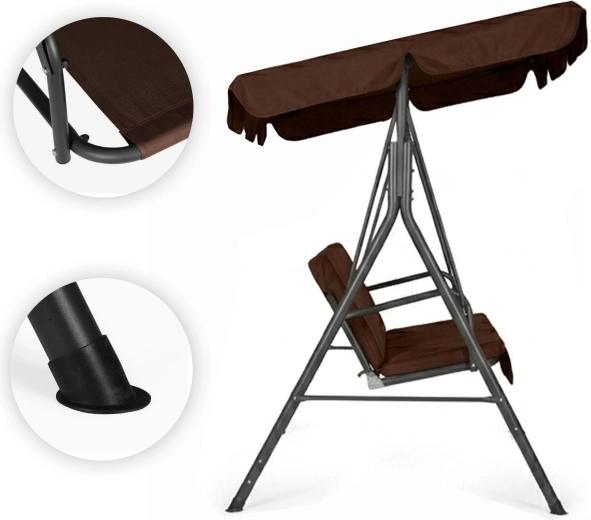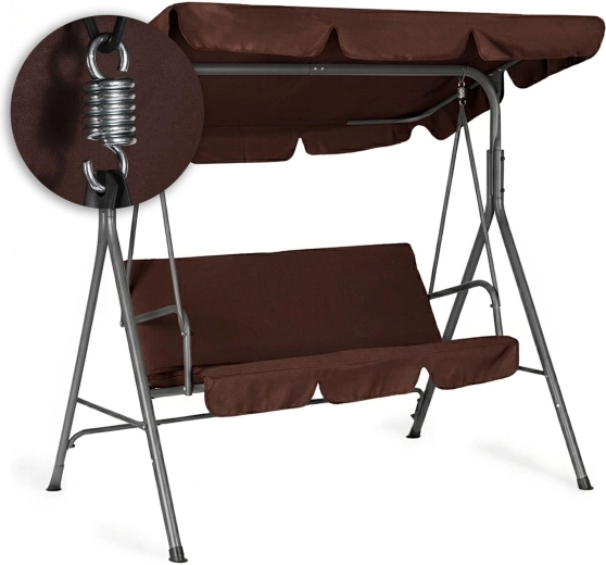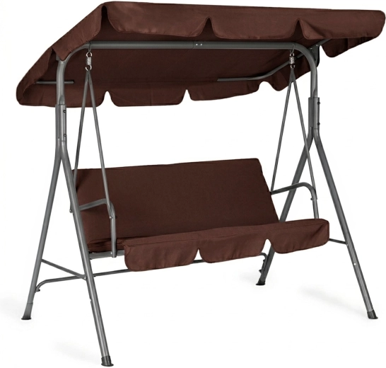 Užijte si pohodlí a klid na zahradě s touto 3místnou zahradní houpačkou v hnědém provedení. Nabízí odolný ocelový rám, nastavitelnou stříšku pro příjemný stín a pevné potahy z Oxford 600D PVC. Díky maximální nosnosti 260 kg, protiskluzovým krytkám nohou a pohodlnému sezení pro 3 osoby je ideální volbou pro terasu, balkon i zahradu.
