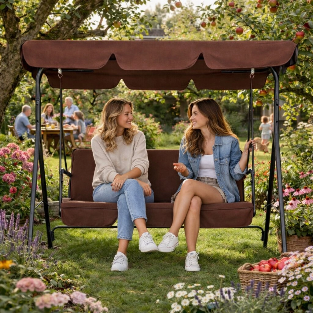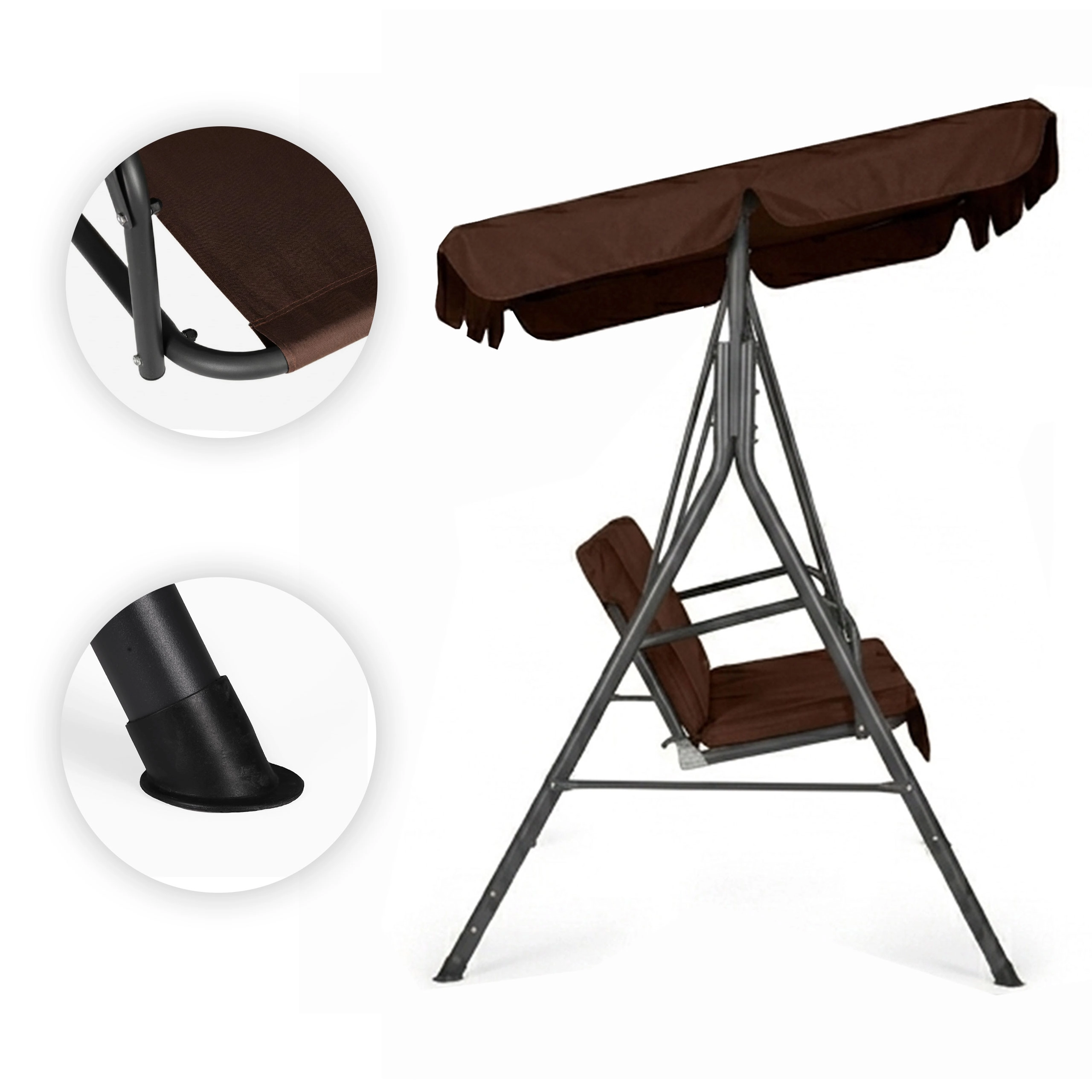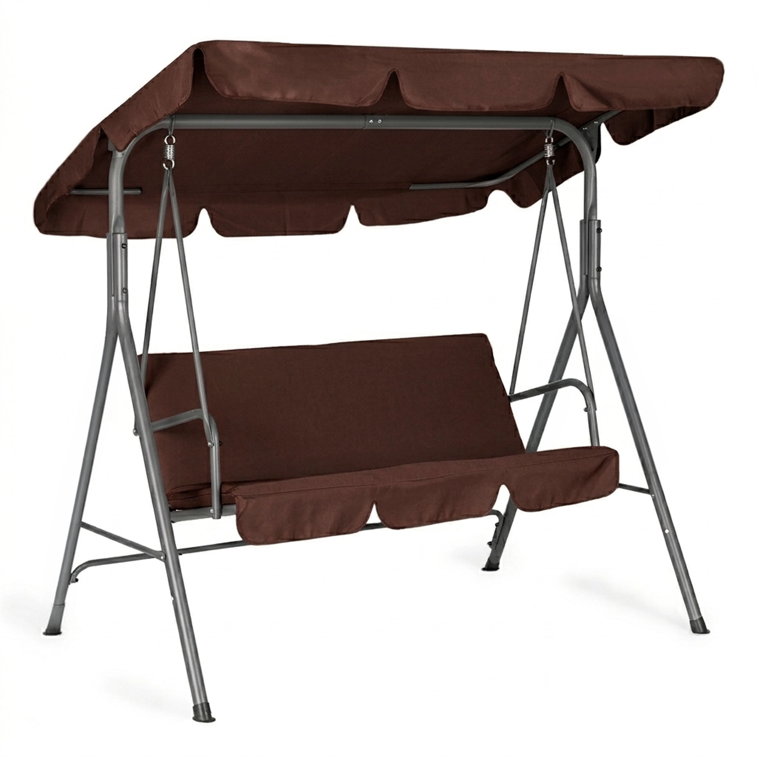 Užijte si pohodlí a klid na zahradě s touto 3místnou zahradní houpačkou v hnědém provedení. Nabízí odolný ocelový rám, nastavitelnou stříšku pro příjemný stín a pevné potahy z Oxford 600D PVC. Díky maximální nosnosti 260 kg, protiskluzovým krytkám nohou a pohodlnému sezení pro 3 osoby je ideální volbou pro terasu, balkon i zahradu.