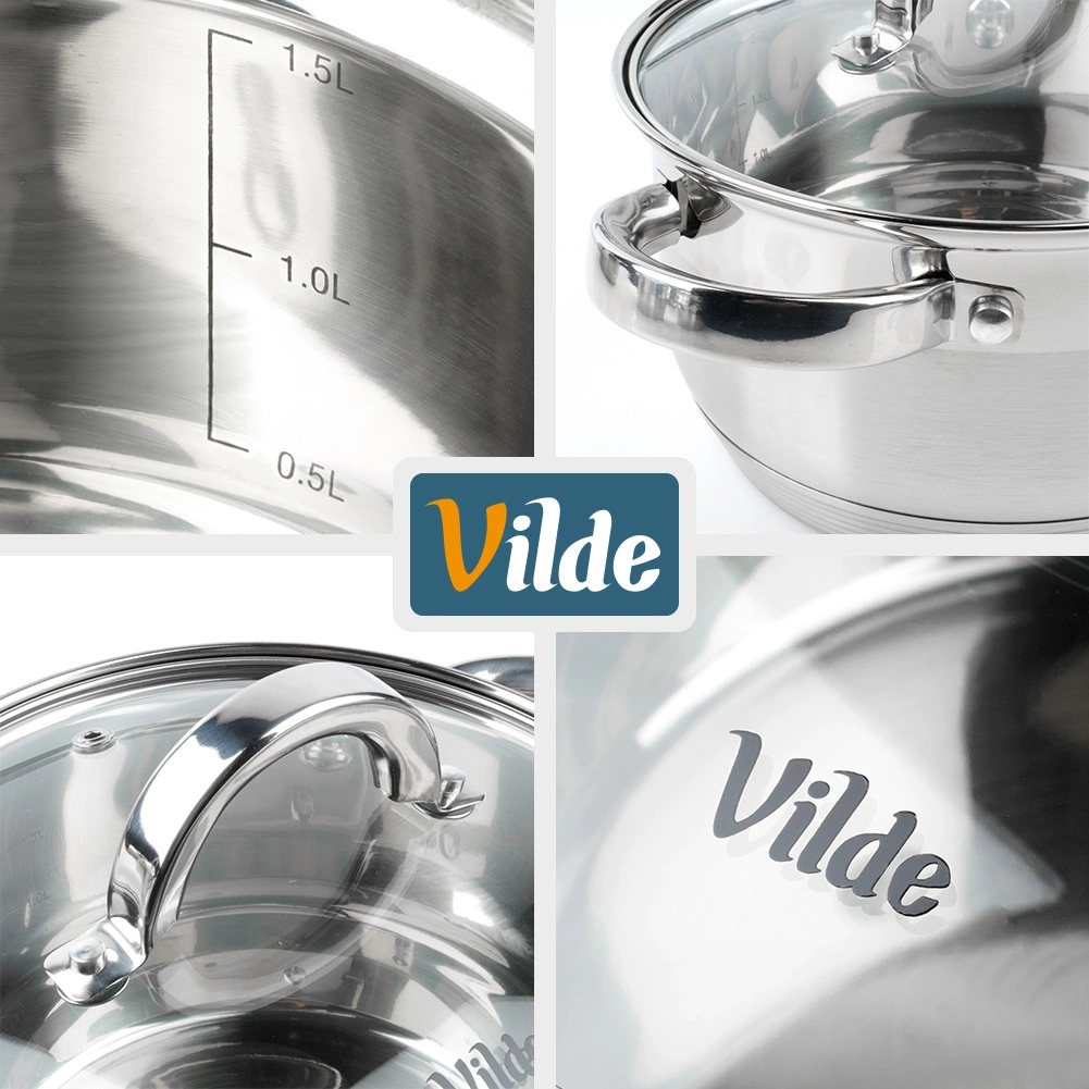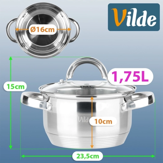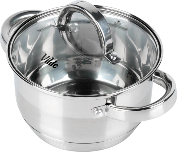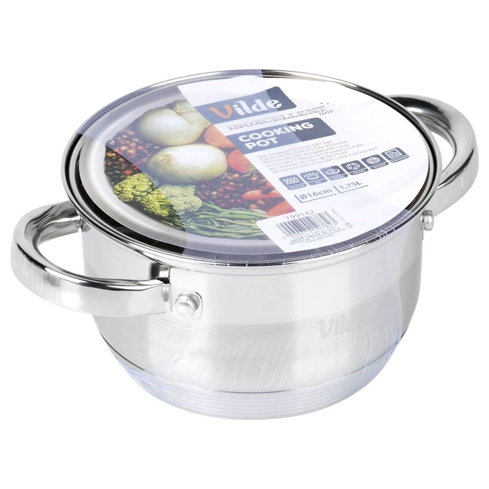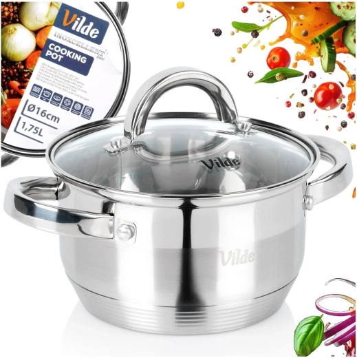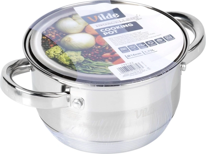 Praktický nerezový hrnec o objemu 1,75 l a průměru 16 cm se skleněnou poklicí s parním ventilem. Díky akutermickému dnu Maximum Power se rychle a rovnoměrně zahřívá, je energeticky úsporný a vhodný pro všechny typy sporáků včetně indukce. Odolá teplotám v troubě do 150 °C a lze jej mýt v myčce. Originální výrobek značky Vilde – Inoxcellent Line.